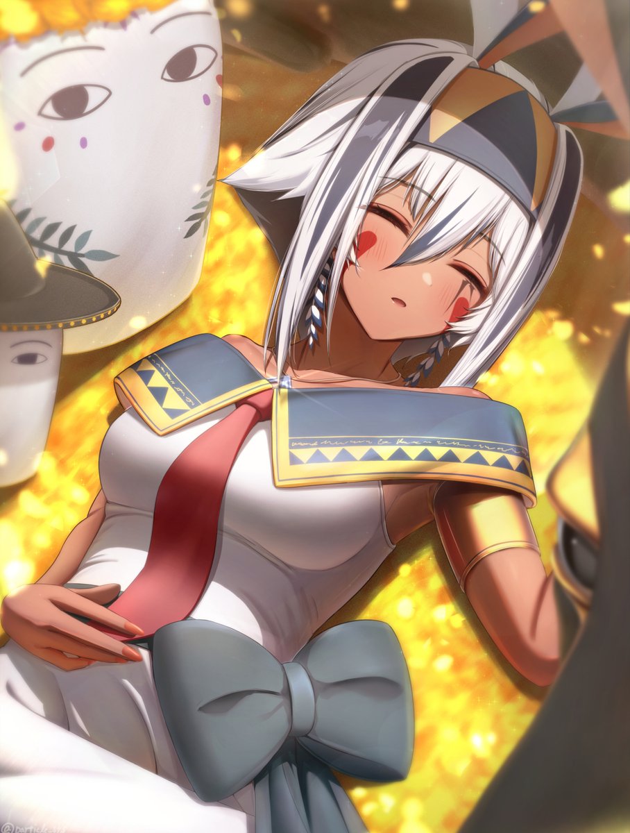 1girl animal_ears bow closed_eyes dark-skinned_female dark_skin dress earrings facial_mark fate/grand_order fate_(series) fingernails hairband hat highres jewelry lying medjed_(fate) nitocris_(fate) nitocris_alter_(event_portrait)_(fate) nitocris_alter_(fate) on_back on_ground particle_sfs sleeping white_dress white_hair