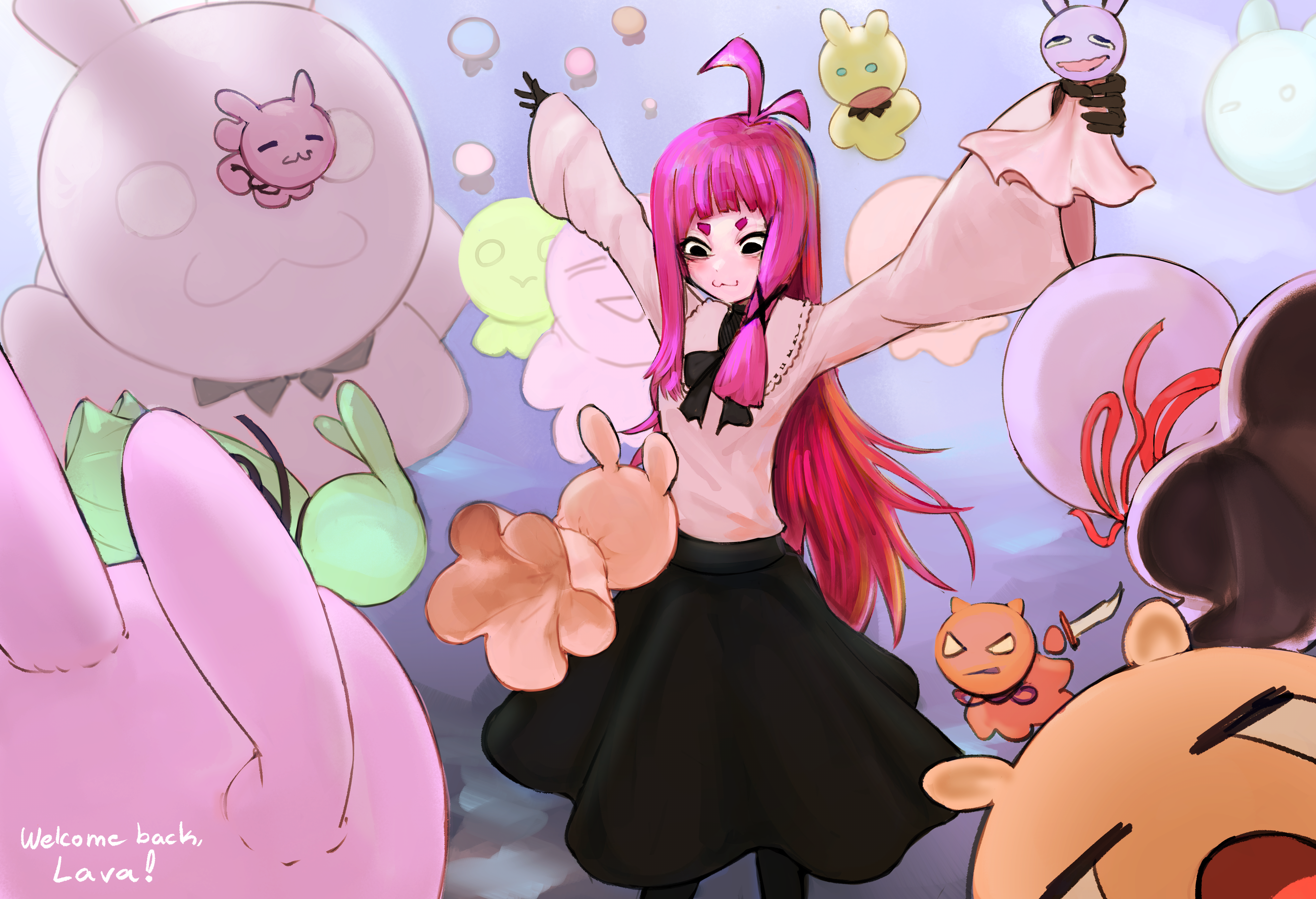 absurdres ahoge bags_under_eyes black_eyes black_gloves black_skirt bright_background cheenmachine colored_skin gloves glowing glowing_eyes hair_between_eyes highres indie_virtual_youtuber long_sleeves pink_hair pink_skin purpur_lavandel ribbon skirt thighhighs
