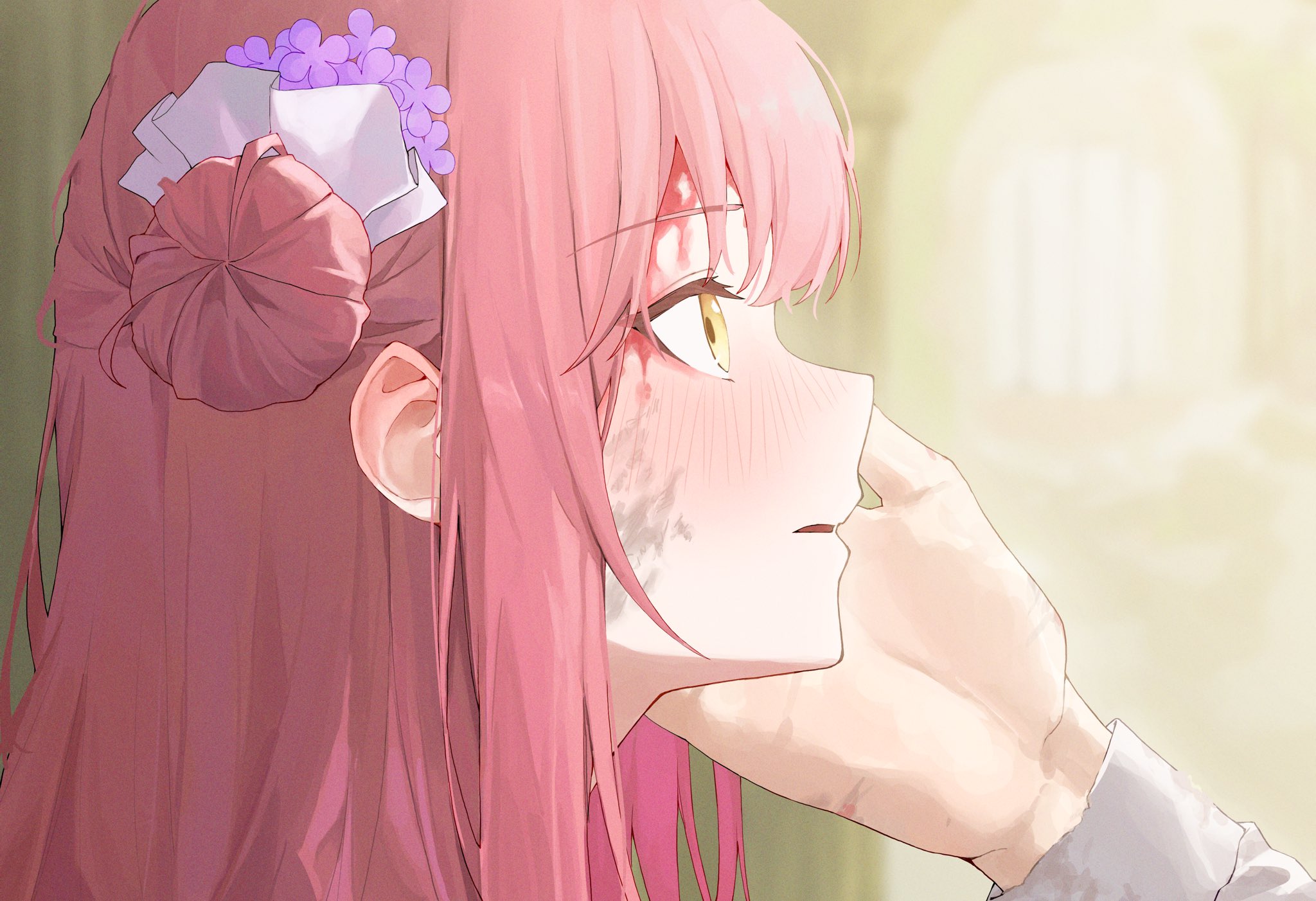 1boy 1girl blood blood_on_face blue_archive blunt_bangs blurry blush bruise bruise_on_face check_commentary commentary commentary_request depth_of_field flower hair_bun hair_flower hair_ornament hair_scrunchie highres indoors injury long_hair long_sleeves mika_(blue_archive) out_of_frame parted_lips pink_hair profile scrunchie sensei_(blue_archive) shirt sidelocks single_side_bun tai_saka white_shirt yellow_eyes