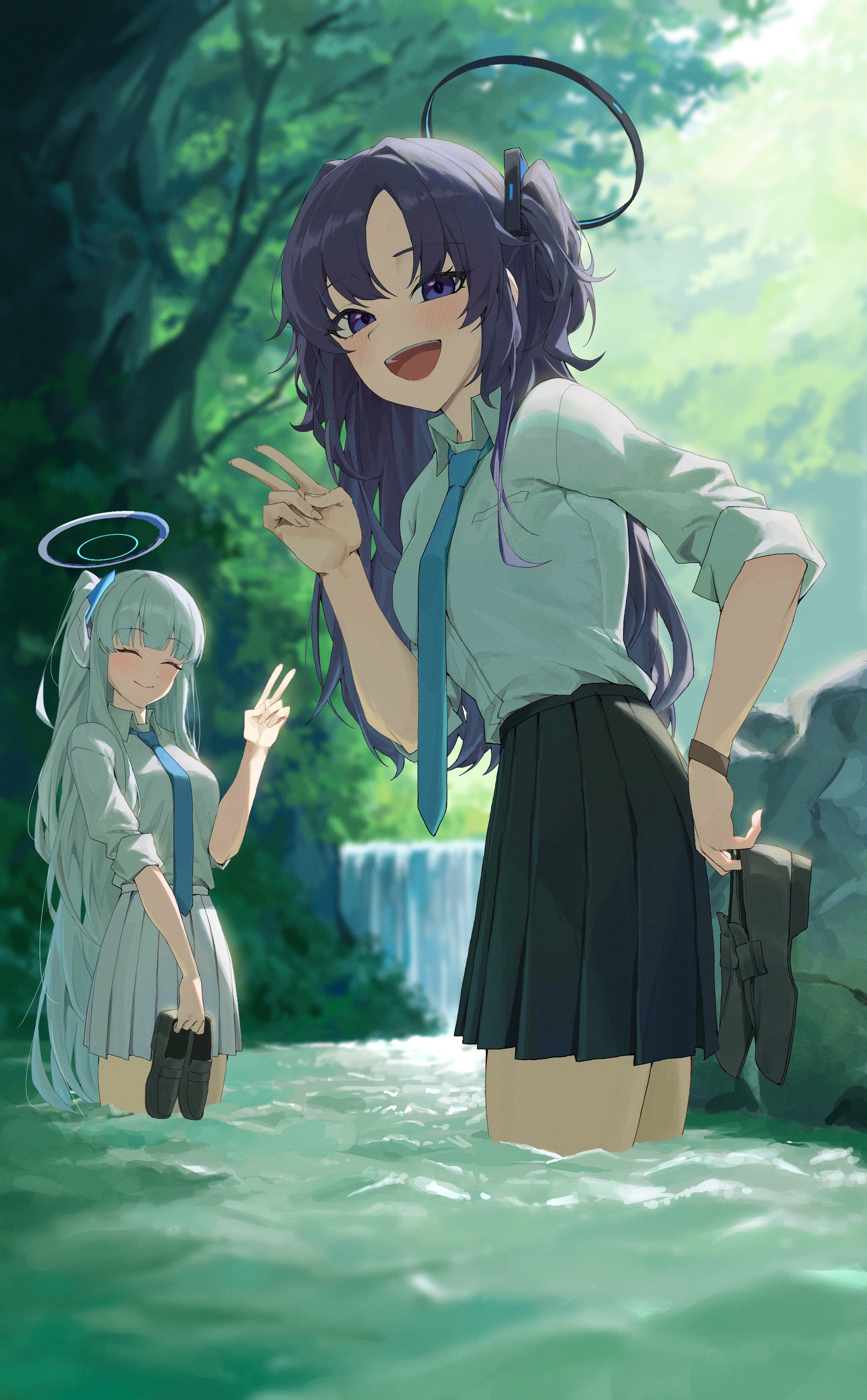 2girls :d ^_^ absurdres alternate_hairstyle backlighting black_skirt blue_archive blunt_bangs blurry closed_eyes collared_shirt commentary_request depth_of_field forest hair_ornament hairband hand_on_own_hip headgear highres in_water leaning_forward long_hair looking_at_viewer multiple_girls nature noa_(blue_archive) open_mouth outdoors parted_bangs pleated_skirt ponytail purple_eyes purple_hair river school_uniform shirt sidelocks skirt sleeves_rolled_up smile summer_uniform tai_saka triangle_hair_ornament two_side_up v water waterfall white_hair white_shirt white_skirt yuuka_(blue_archive)