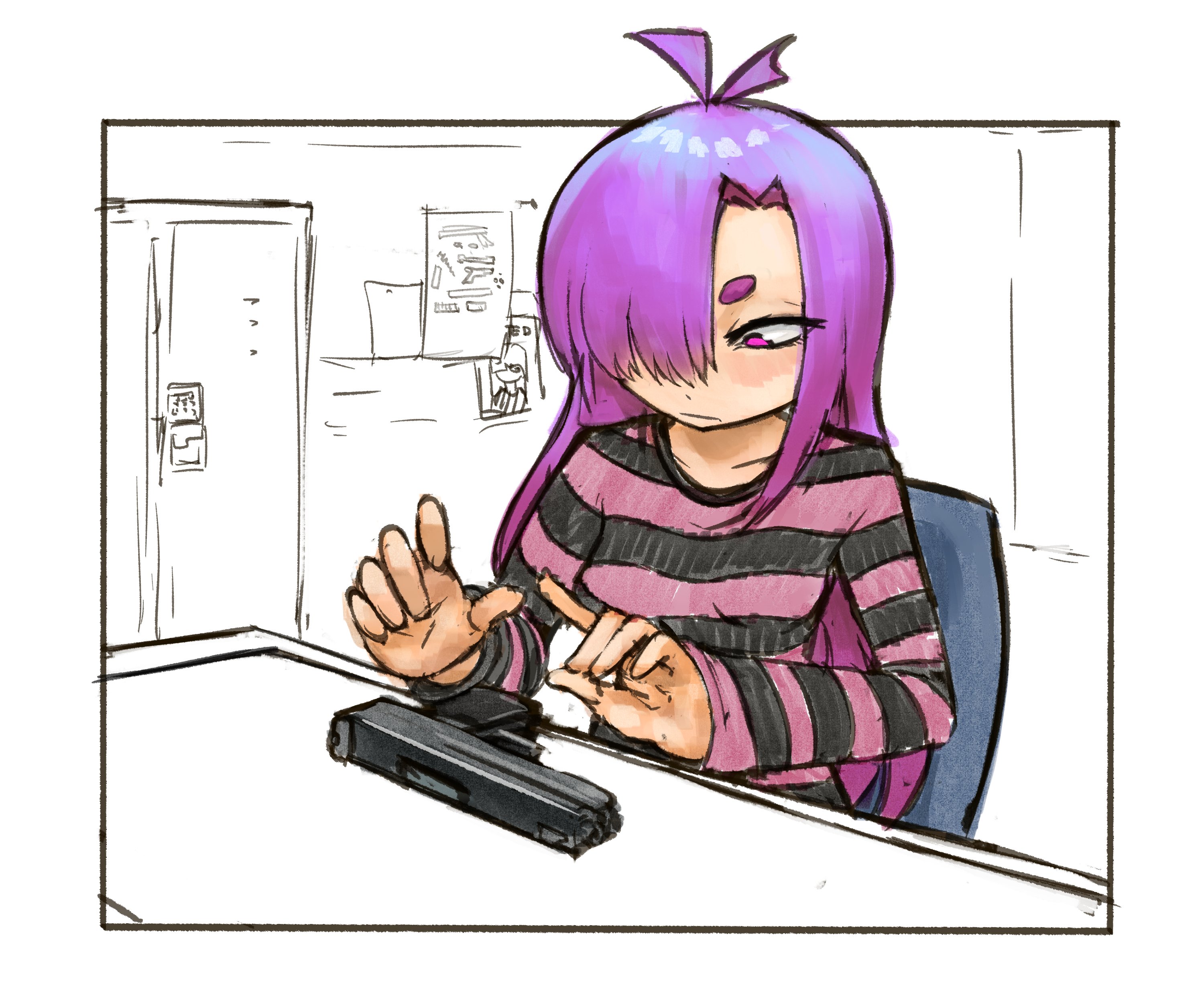 absurdres ahoge bags_under_eyes black_eyes black_gloves cheenmachine colored_skin gloves glowing glowing_eyes gun hair_between_eyes highres indie_virtual_youtuber long_sleeves pink_eyes pink_hair pink_skin purpur_lavandel shirt striped_clothes striped_shirt sweater weapon