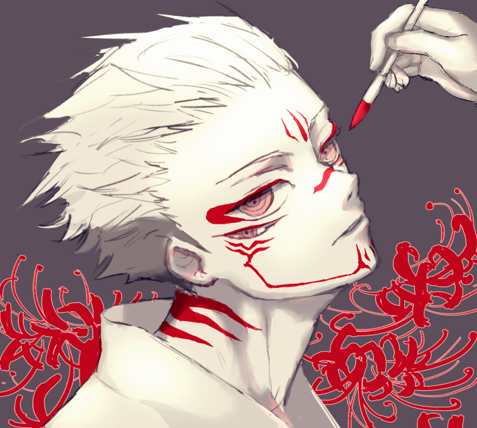 1boy applying_makeup eyeliner eyeshadow facepaint flower grey_background holding holding_paintbrush jujutsu_kaisen makeup male_focus out_of_frame oxoxovo paintbrush partially_colored portrait red_eyes red_flower red_theme ringed_eyes ryoumen_sukuna_(jujutsu_kaisen) short_hair solo_focus spider_lily spiked_hair twitter_logo