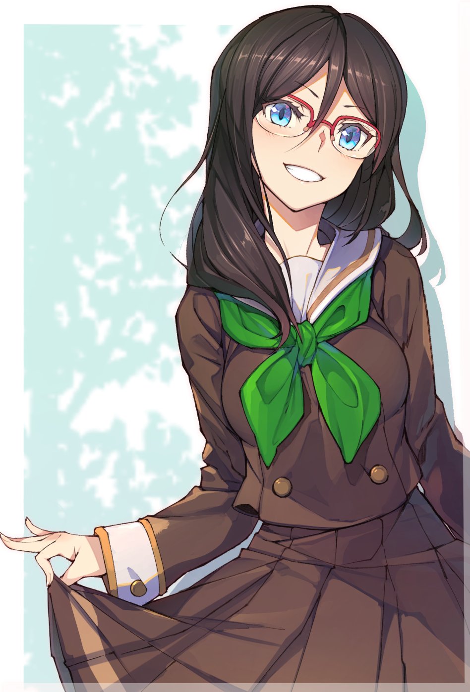 1girl 3s_(tarariko) aqua_background black_hair blue_background blue_eyes border breasts brown_serafuku brown_skirt buttoned_cuffs buttons clothes_lift cowboy_shot double-breasted double-parted_bangs drop_shadow eyelashes glasses green_neckerchief grin hair_between_eyes head_tilt hibike!_euphonium highres holding_own_skirt lifting_own_clothes long_hair long_sleeves looking_at_viewer medium_breasts neckerchief open_mouth outside_border over-rim_eyewear pleated_skirt red-framed_eyewear sailor_collar school_uniform semi-rimless_eyewear serafuku single_stripe skirt skirt_lift smile solo striped_clothes striped_skirt tanaka_asuka white_border white_sailor_collar
