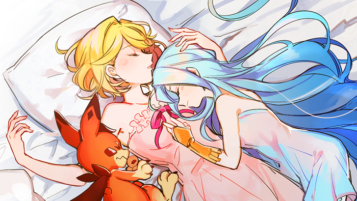 2girls bare_arms bed_sheet blonde_hair blue_dress blue_hair closed_mouth collarbone cunonn djeeta_(granblue_fantasy) dress from_above granblue_fantasy long_hair lying lyria_(granblue_fantasy) multiple_girls on_back on_side parted_lips pillow pink_dress red_ribbon ribbon short_dress short_hair sleeping straight_hair strapless strapless_dress very_long_hair yuri