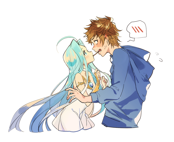 1boy 1girl armlet blank_eyes blue_eyes blue_gem blue_hair blue_jacket blush brown_hair cropped_legs cunonn dress eye_contact floating_hair from_side gem gran_(granblue_fantasy) granblue_fantasy hood hood_down hooded_jacket incoming_pocky_kiss jacket jewelry long_hair long_sleeves looking_at_another lyria_(granblue_fantasy) short_hair simple_background sketch sleeveless sleeveless_dress speech_bubble very_long_hair white_background white_dress