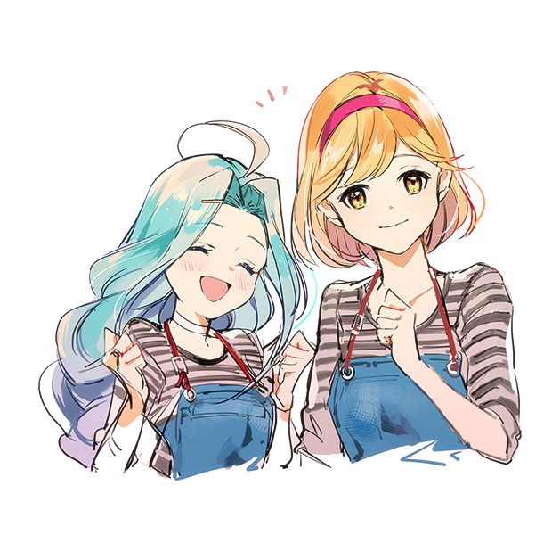 2girls :d blonde_hair blue_hair blue_overalls choker closed_eyes collarbone cropped_torso cunonn djeeta_(granblue_fantasy) granblue_fantasy hair_intakes hairband long_hair long_sleeves looking_at_viewer lyria_(granblue_fantasy) medium_hair multiple_girls open_mouth overalls pink_hairband shirt simple_background sketch smile striped_clothes striped_shirt upper_body white_background white_choker yellow_eyes