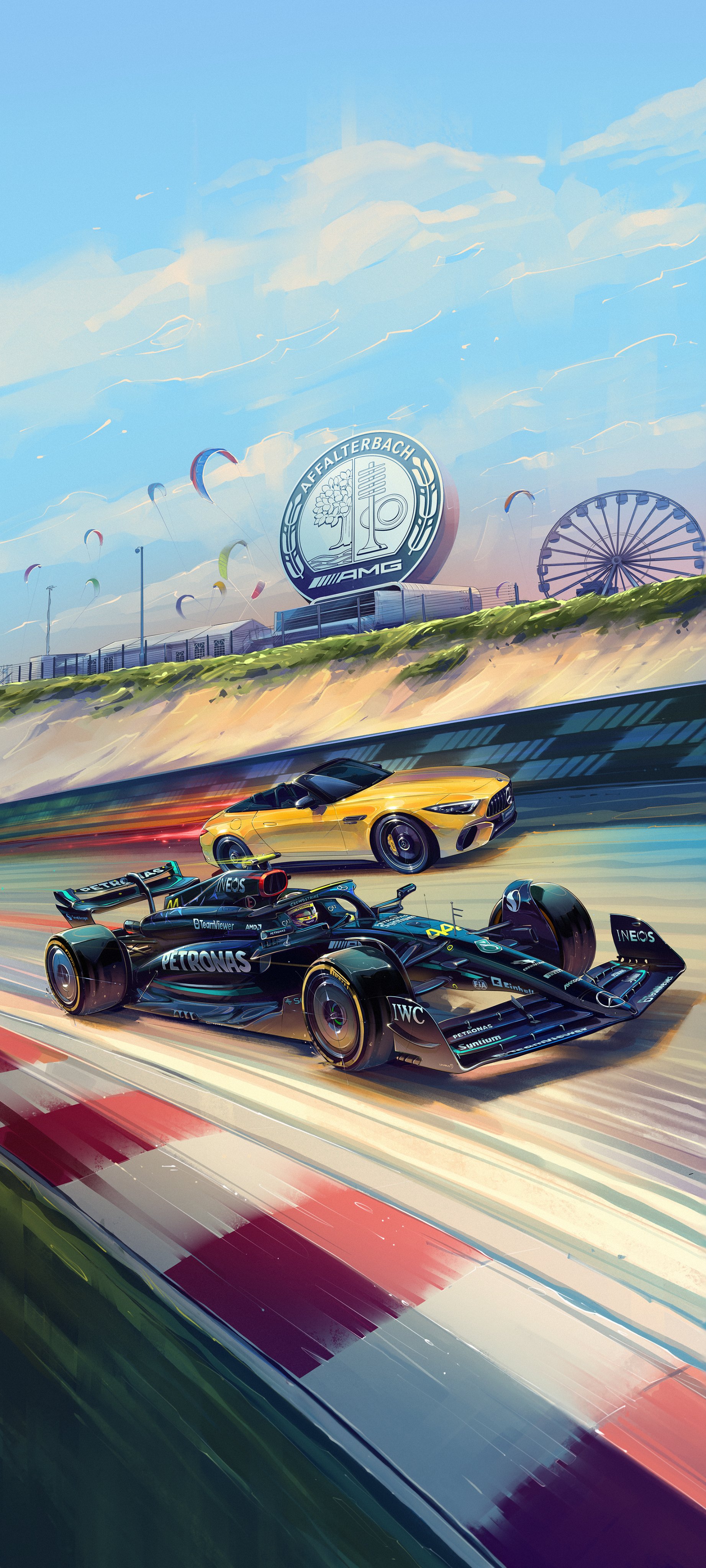 1boy absurdres andrew_mytro car circuit_zandvoort cloud commentary convertible english_commentary ferris_wheel formula_one formula_racer highres lewis_hamilton mercedes-benz_sl63_amg motion_blur motor_vehicle official_art racecar racetrack real_life real_world_location sky spoiler_(automobile) sports_car vehicle_focus