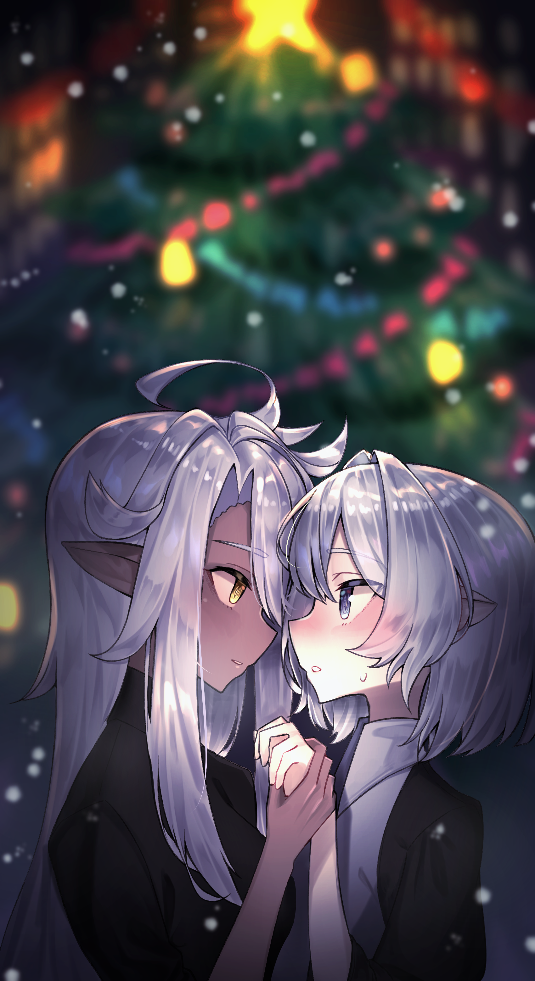 2girls absurdres ahoge black_jacket blue_eyes blush christmas christmas_tree commentary dark-skinned_female dark_skin elf english_commentary eye_contact from_side grey_hair highres holding_hands jacket long_hair looking_at_another multiple_girls myanja nervous_sweating pointy_ears short_hair sidelocks snowing sweat sweatdrop yellow_eyes yuri
