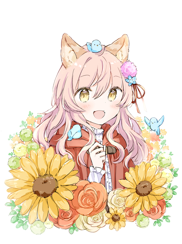 1girl :d animal animal_ear_fluff animal_ears animal_on_head bird bird_on_head blue_flower brown_eyes capelet center_frills commentary_request flower frills hair_between_eyes hair_flower hair_ornament hair_ribbon hand_up hood hood_down hooded_capelet long_sleeves on_head open_mouth original pink_flower pink_hair red_capelet red_flower red_ribbon red_rose ribbon rose shirt simple_background sleeves_past_wrists smile solo sunflower upper_body wataame27 white_background white_shirt wolf-chan_(wataame27) wolf_ears yellow_flower