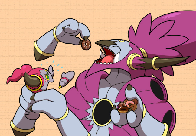 aoi_(comical_highway) colored_sclera earrings eating food full_body gen_6_pokemon happy hoop_earrings hoopa hoopa_(confined) hoopa_(unbound) jewelry legendary_pokemon looking_at_another multiple_persona mythical_pokemon nintendo no_humans pokemon pokemon_(anime) pokemon_(creature) pokemon_the_movie:_hoopa_and_the_clash_of_ages pokemon_xy_(anime) smile solo yellow_sclera