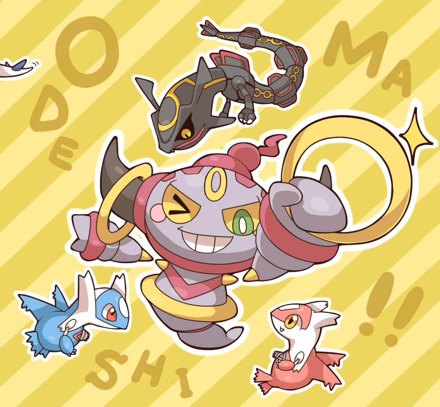 ! !! 2027_(submarine2027) alternate_color brother_and_sister colored_sclera donut dragon_tail earrings food full_body gen_2_pokemon gen_3_pokemon gen_6_pokemon grin happy hoop_earrings hoopa hoopa_(confined) jewelry latias latios legendary_pokemon looking_at_viewer lugia mythical_pokemon nintendo no_humans one_eye_closed pokemon pokemon_(anime) pokemon_(creature) pokemon_the_movie:_hoopa_and_the_clash_of_ages pokemon_the_series:_xy rayquaza shiny_pokemon siblings smile tail wings wink yellow_sclera