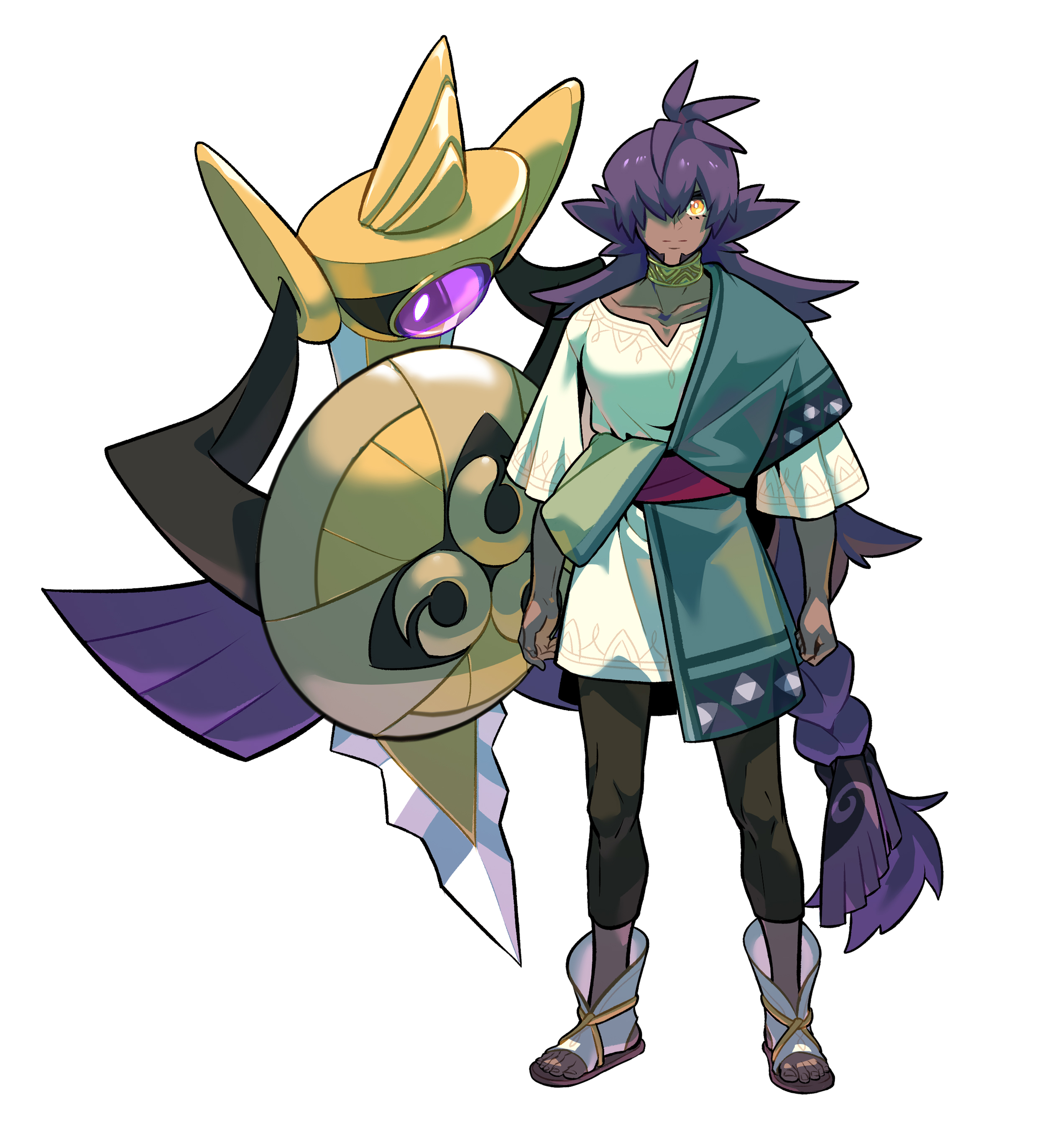 1boy absurdres aegislash arms_at_sides closed_mouth collar collarbone commentary_request dark-skinned_male dark_skin gen_6_pokemon hair_over_one_eye highres jewelry knees korean_commentary leggings leon_(pokemon) long_hair looking_at_viewer male_focus nintendo pokemon pokemon_(creature) pokemon_sword_and_shield purple_hair redlhzz shoes simple_background smile split_mouth standing toeless_footwear white_background yellow_eyes