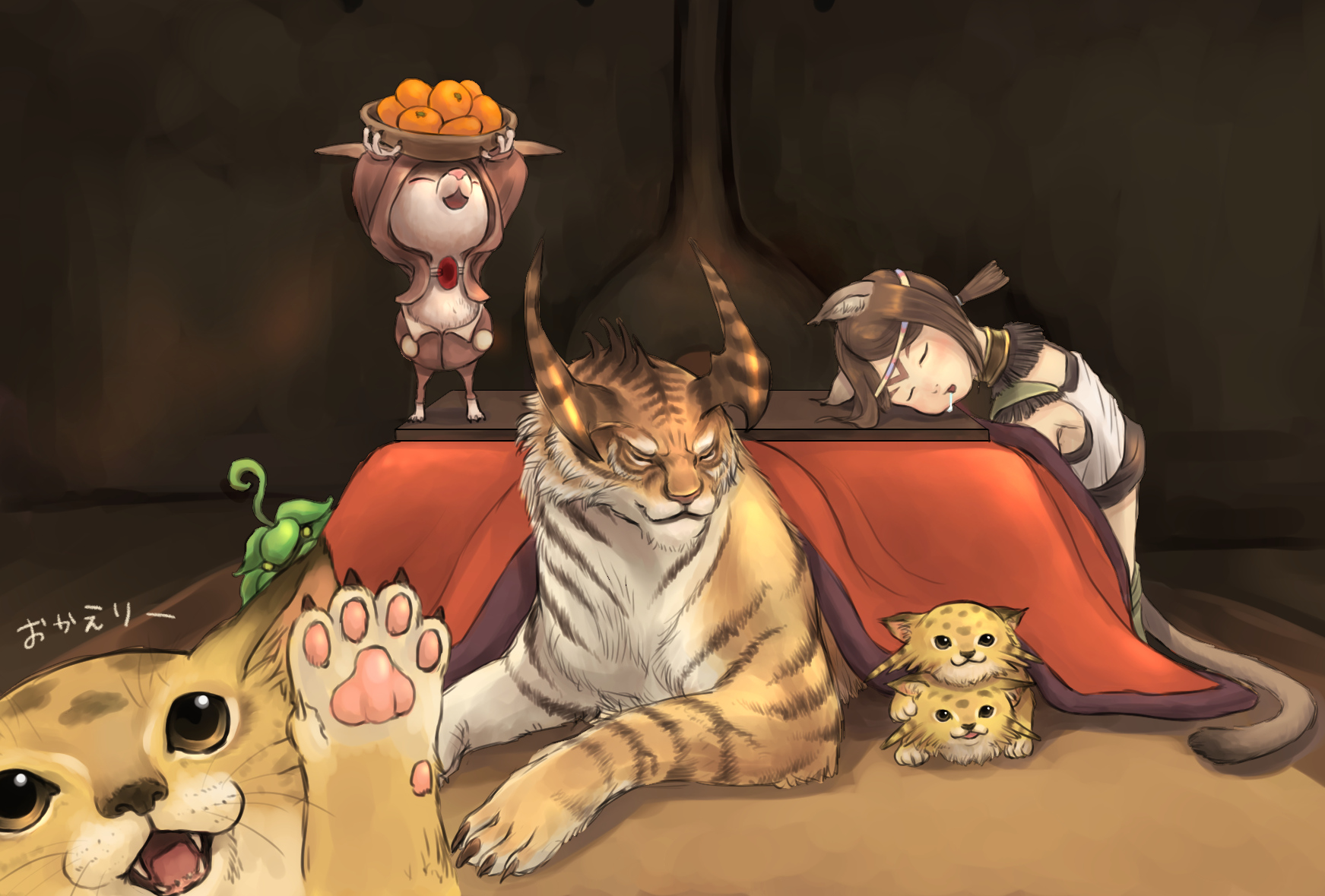 1girl animal_ears adventurer_(ff11) bowl brown_hair brown_tail cactus41747280 cat_ears cat_girl cat_tail chacharoon circlet closed_eyes coeurl_(final_fantasy) darrcuiln drooling final_fantasy final_fantasy_xi food fruit head_down head_on_table highres indoors kotatsu leafkin mandarin_orange mithra_(ff11) no_eyebrows open_mouth parted_bangs qiqirn short_hair sitting sleeping solo table tail under_kotatsu under_table
