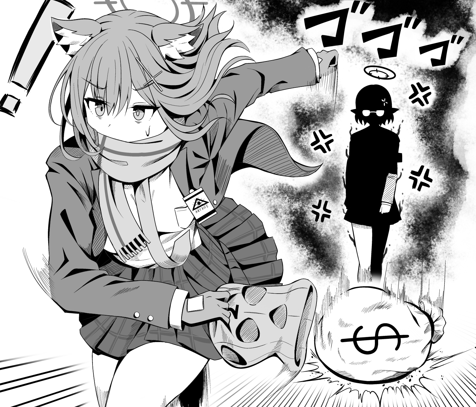 ! 2girls angry animal_ear_fluff animal_ears aura ayane_(blue_archive) balaclava blazer blue_archive buttoned_cuffs buttons collared_shirt commentary_request cross_hair_ornament dollar_sign extra_ears fleeing glasses greyscale hair_between_eyes hair_ornament halo highres holding holding_mask id_card jacket karikura_(atatata71) long_sleeves looking_at_another mask medium_hair monochrome multiple_girls necktie plaid_clothes plaid_skirt pleated_skirt pointy_ears running sack scarf school_uniform shiroko_(blue_archive) shirt short_hair sidelocks skirt sweatdrop translation_request unworn_mask v-shaped_eyebrows wolf_ears wolf_girl