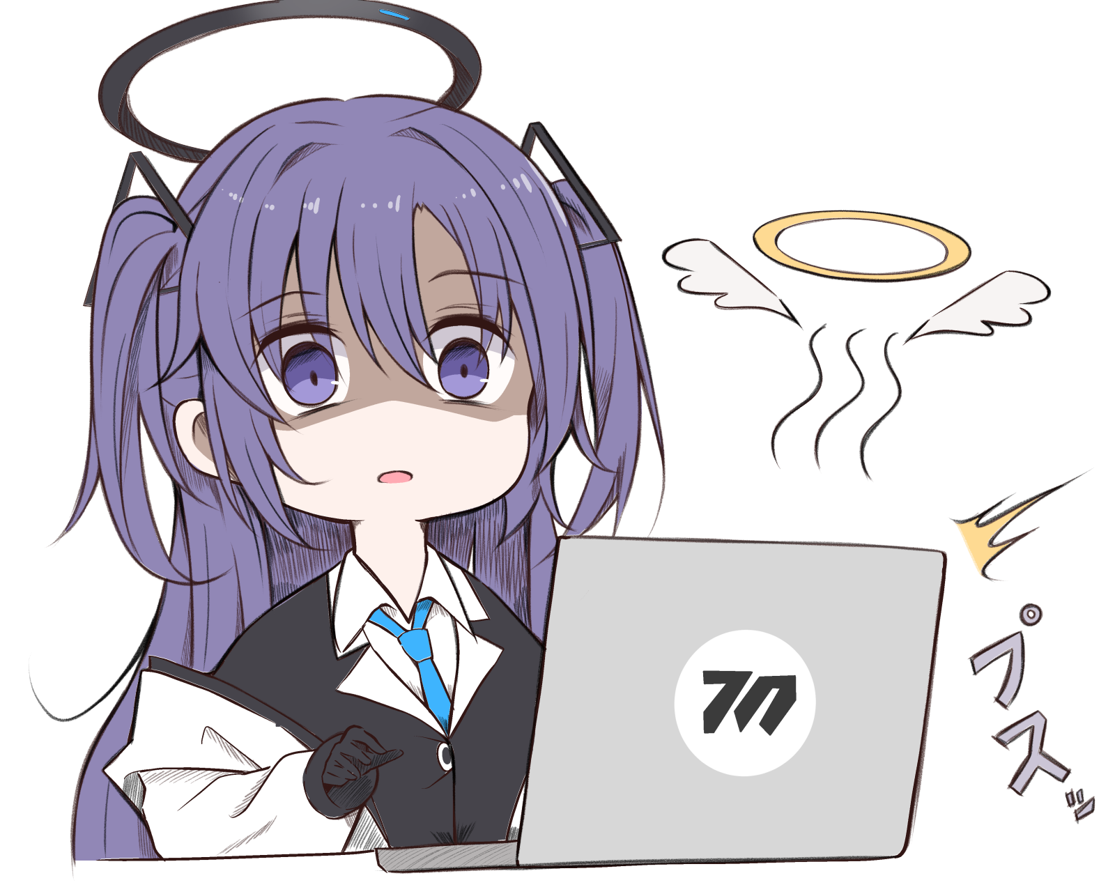 1girl :o black_gloves blazer blue_archive blue_necktie coat collared_shirt commentary_request computer frustrated giving_up_the_ghost gloom_(expression) gloves hair_ornament halo highres jacket karikura_(atatata71) laptop long_hair long_sleeves looking_at_viewer necktie open_clothes open_coat parted_bangs parted_lips purple_eyes purple_hair school_uniform shaded_face shirt simple_background solo surprised triangle_hair_ornament two_side_up white_background white_coat yuuka_(blue_archive)