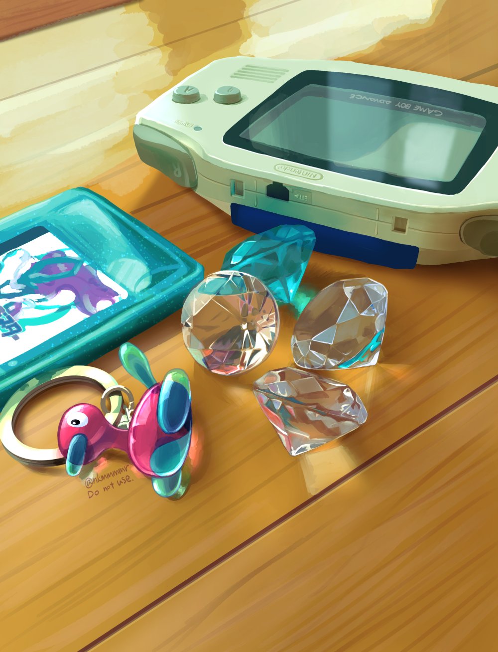 blue_gem charm_(object) funahashi_(nkmmmmr) game_boy_advance game_boy_advance_(original) gem gen_2_pokemon handheld_game_console highres nintendo no_humans pokemon pokemon_(creature) porygon2 realistic white_gem wooden_floor