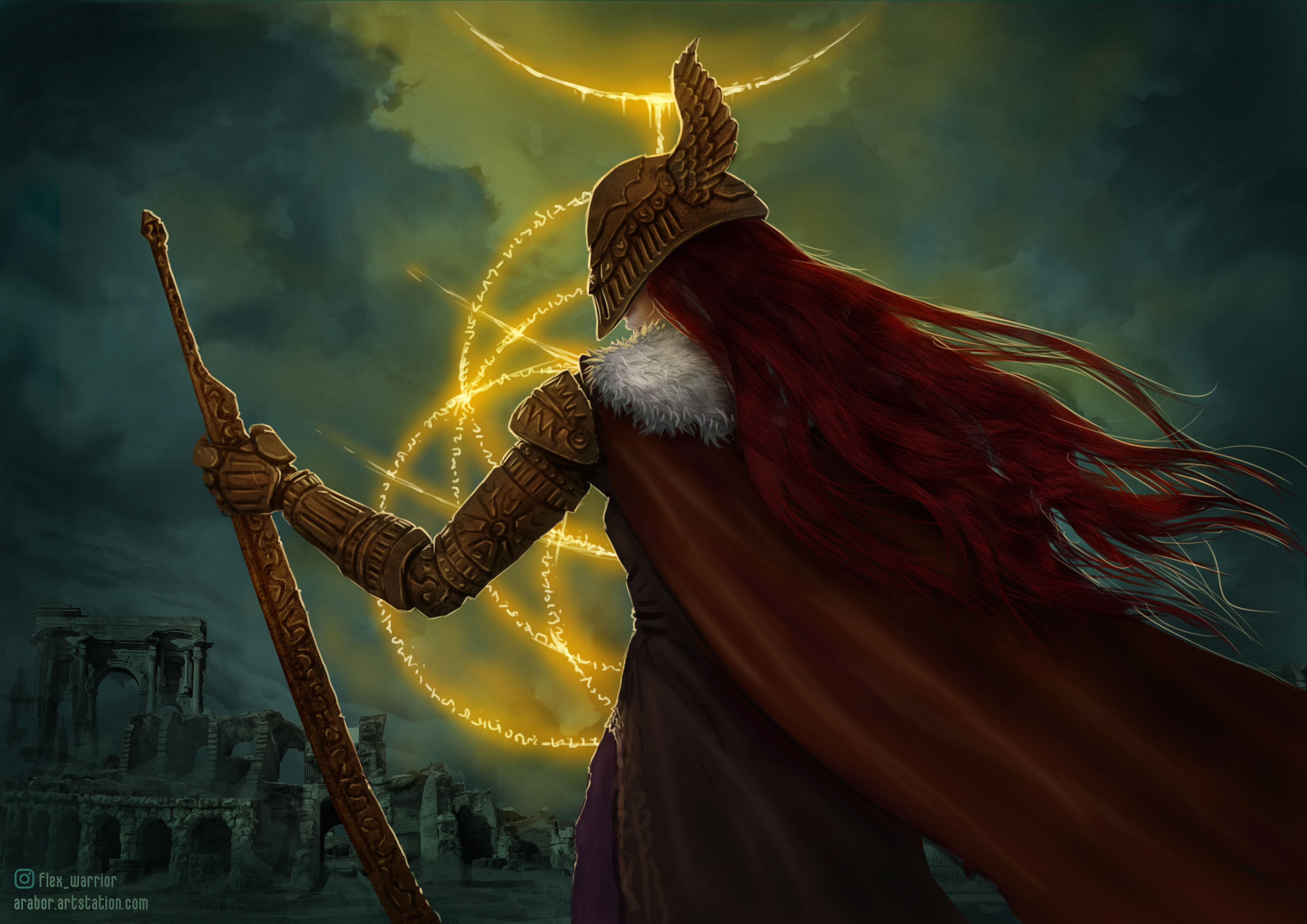 1girl absurdres arabor cape covered_eyes elden_ring elden_ring_(object) from_side green_background helmet helmet_over_eyes highres holding holding_sword holding_weapon katana long_hair malenia_blade_of_miquella prosthesis prosthetic_arm red_cape red_hair ruins sword valkyrie warrior weapon winged_helmet