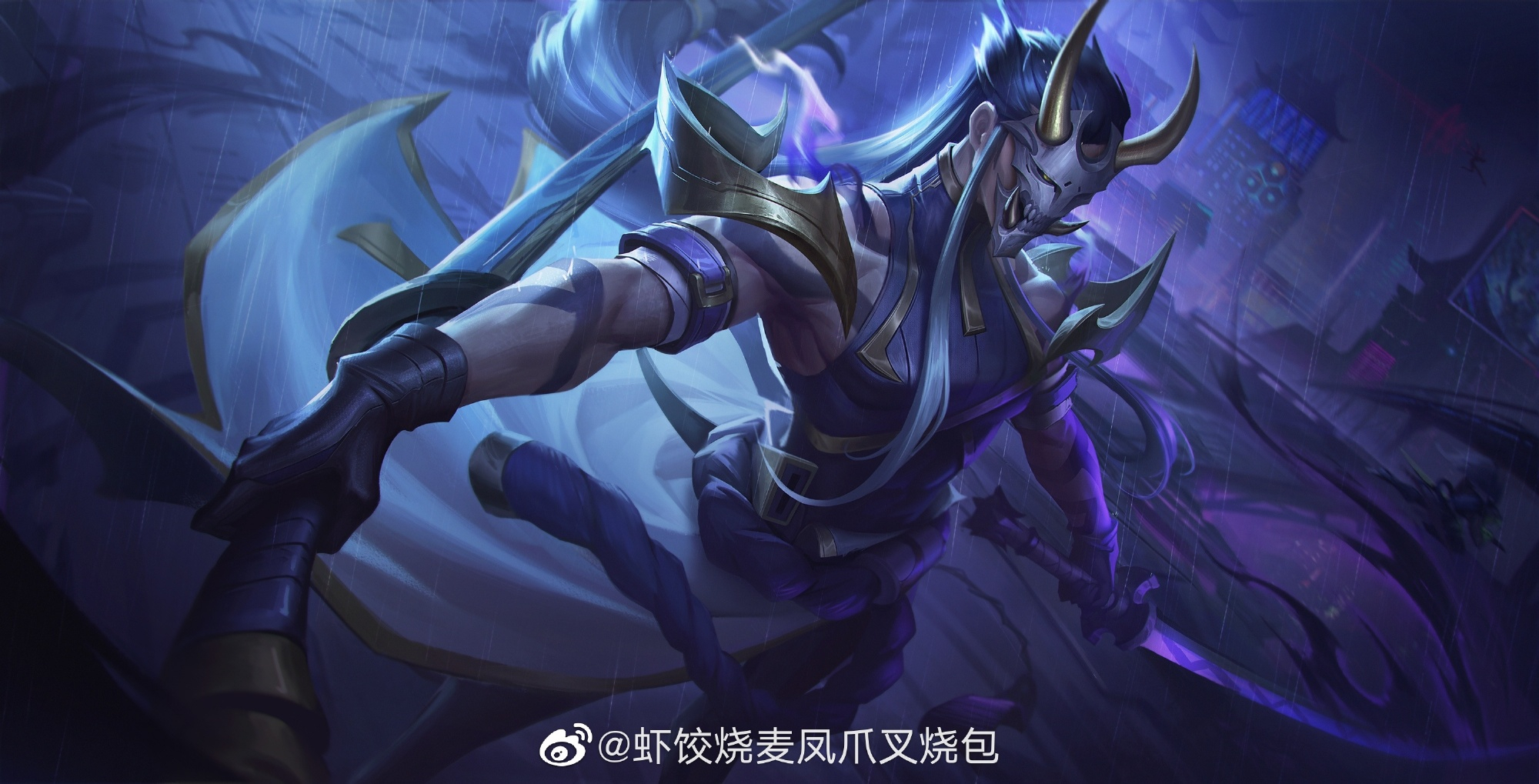 1boy arm_tattoo artist_name black_gloves black_hair building cityscape cowboy_shot demon_horns gloves highres holding holding_sword holding_weapon horns inkshadow_yone league_of_legends long_hair looking_ahead male_focus mask multicolored_hair muscular muscular_male official_alternate_costume outdoors rain solo standing streaked_hair sword tattoo watermark weapon weibo_2467496890 weibo_watermark yellow_eyes yone_(league_of_legends)