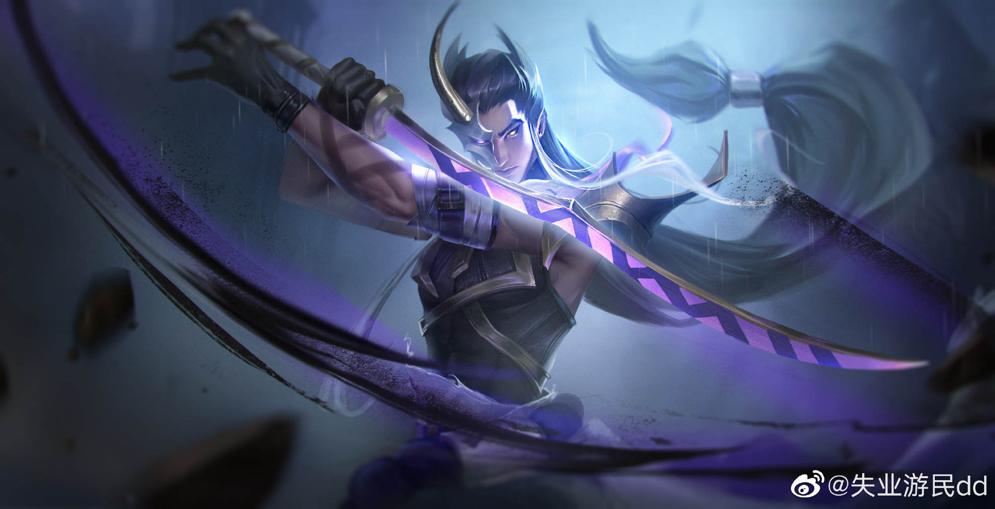 1boy artist_name black_gloves black_hair closed_mouth demon_horns expressionless fighting_stance gloves glowing glowing_eyes half_mask heterochromia highres holding holding_sword holding_weapon horns incoming_attack inkshadow_yone league_of_legends light long_hair looking_at_viewer male_focus mask multicolored_hair muscular muscular_male no_pupils official_alternate_costume oni_mask purple_eyes rock rooftop solo standing streaked_hair sword upper_body weapon workless_rooftop yellow_eyes yone_(league_of_legends)