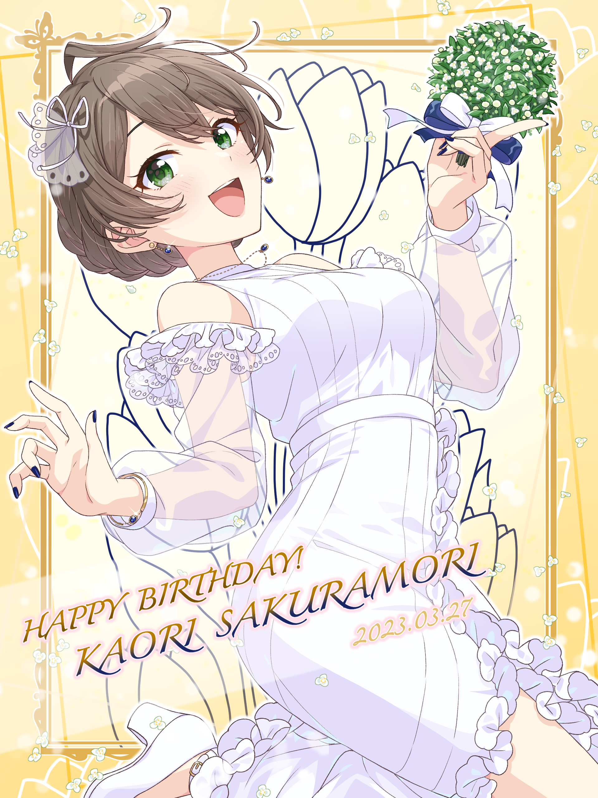 1girl absurdres ahoge bare_shoulders black_nails blush bouquet bow bracelet braid breasts brown_hair character_name cowboy_shot detached_sleeves dress earrings falling_flower floral_background flower from_side green_eyes hair_between_eyes hair_bow hair_ribbon hands_up happy_birthday high_heels highres holding holding_bouquet idolmaster idolmaster_million_live! idolmaster_million_live!_theater_days jewelry large_breasts leg_up light_brown_hair looking_at_viewer nail_polish necklace open_mouth ribbon sakuramori_kaori see-through_clothes see-through_sleeves shiro_(ongrokm) short_hair sleeveless sleeveless_dress smile solo standing standing_on_one_leg teeth tulip upper_teeth_only white_dress white_footwear white_ribbon yellow_background