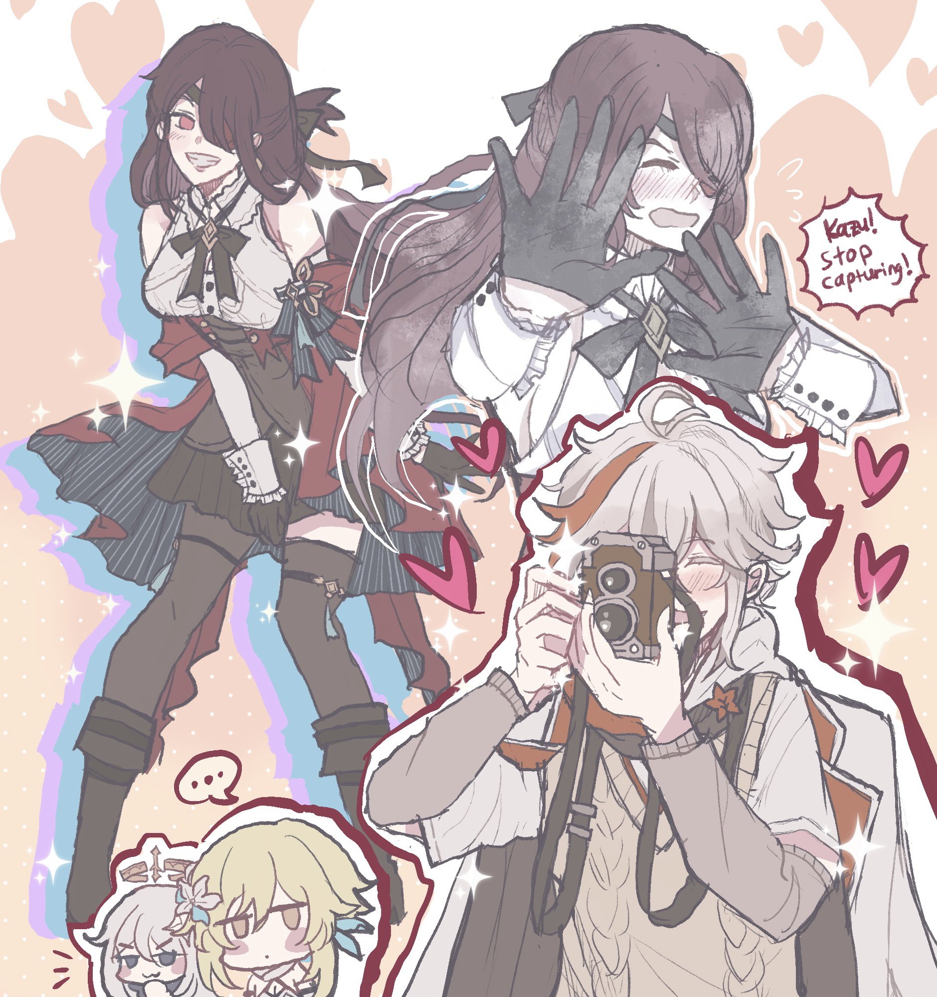 ... 1boy 3girls ahoge beidou_(genshin_impact) black_hair blush camera chibi couple full_body genshin_impact gloves grey_hair hair_over_one_eye heart highres holding holding_camera kaedehara_kazuha kasep lumine_(genshin_impact) multicolored_hair multiple_girls paimon_(genshin_impact) red_eyes red_hair short_hair streaked_hair sweater upper_body