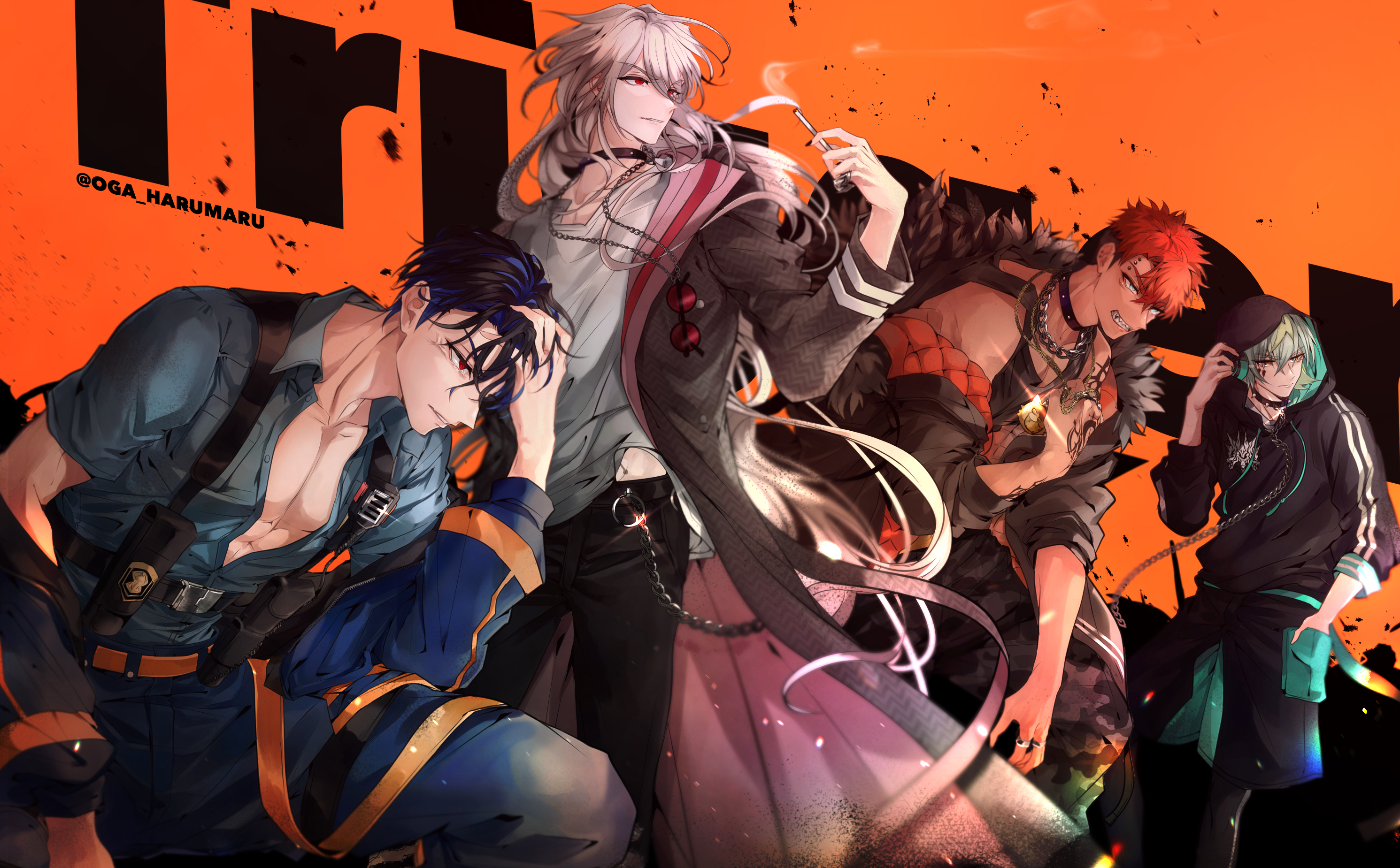 4boys black_hair blue_hair cigarette facing_to_the_side goku_luck_(paradox_live) green_hair highres holding holding_cigarette inukai_yuto kaida_shion long_hair male_focus mikoshiba_kenta multicolored_hair multiple_boys orange_background paradox_live phantometal_(paradox_live) pink_hair red_eyes red_hair short_hair sirofuku414 tosa_ryoga twitter_username yellow_eyes