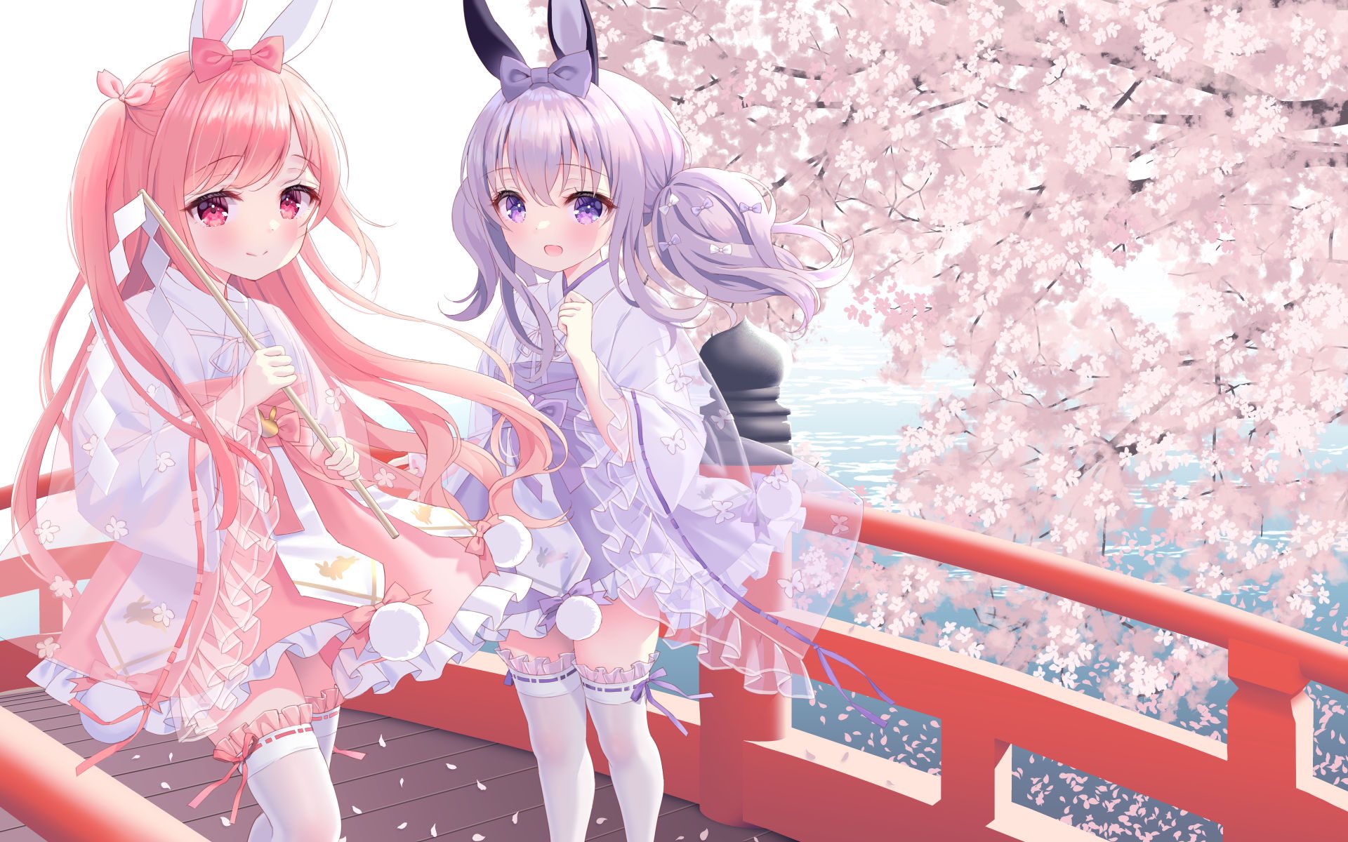 2girls :d animal_ears bow branch bridge bunny_day chitosezaka_suzu closed_mouth commentary_request feet_out_of_frame flower frilled_skirt frilled_sleeves frilled_thighhighs frills hair_between_eyes hair_bow highres japanese_clothes kimono long_sleeves multiple_girls open_mouth original petals pink_flower pink_hair pink_skirt purple_bow purple_eyes purple_hair purple_skirt rabbit_ears red_bow red_eyes revision ribbon-trimmed_legwear ribbon_trim see-through_clothes skirt smile thighhighs twintails two_side_up water white_kimono white_thighhighs wide_sleeves