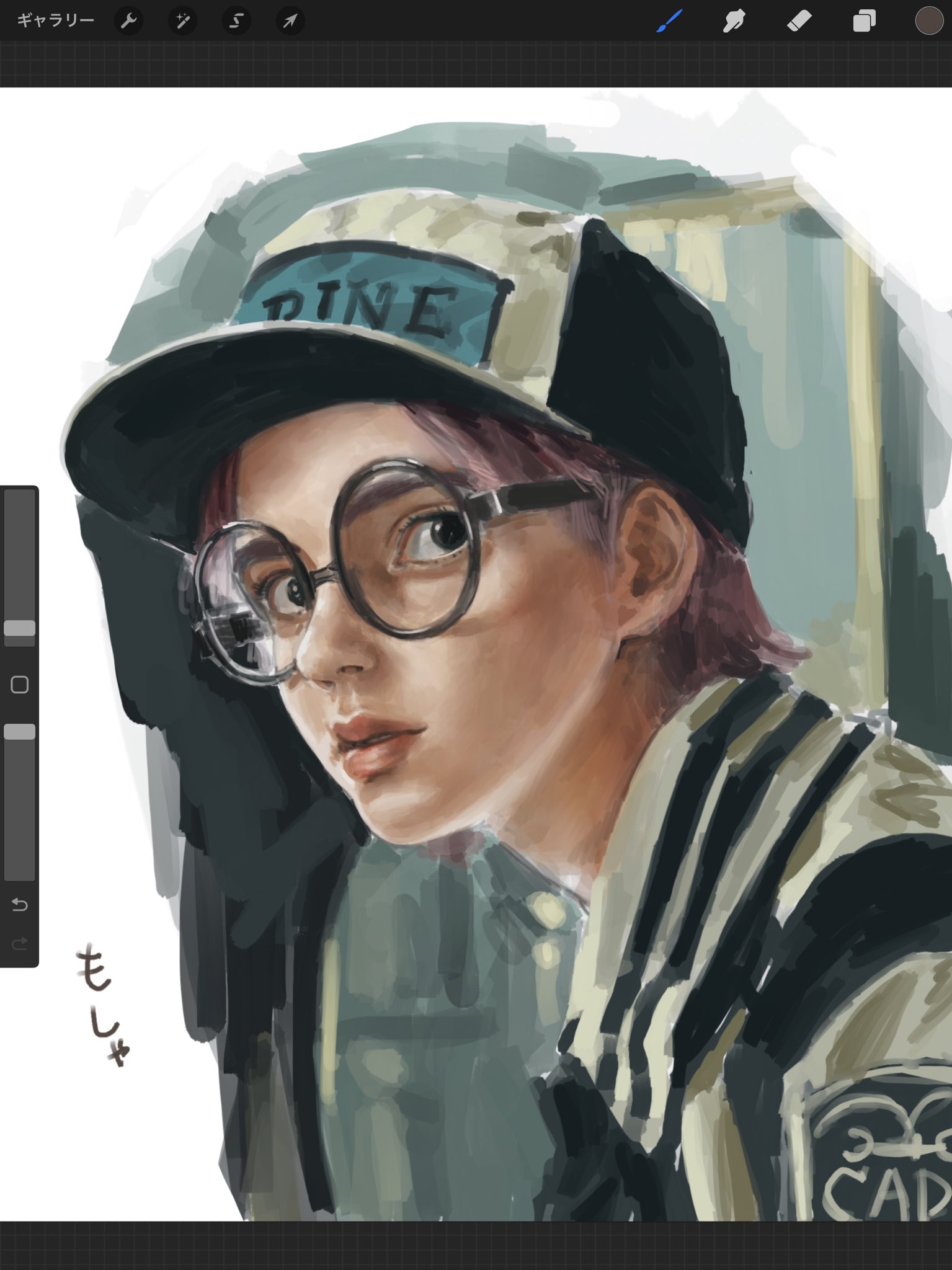 1boy art_program_in_frame baseball_cap clothes_writing koby_(one_piece) commentary_request glasses hat highres live_action looking_at_viewer male_focus marine_uniform_(one_piece) one_piece one_piece_(live_action) painterly pink_hair procreate_(medium) procreate_(software) realistic round_eyewear short_hair solo unfinished upper_body urasanmyaku