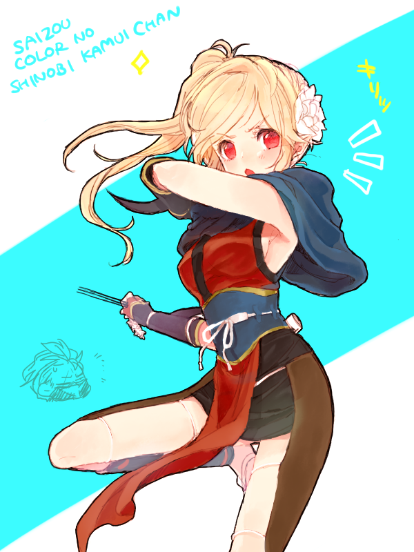 1girl alternate_costume breasts female_corrin_(fire_emblem) cosplay facing_viewer fire_emblem fire_emblem_fates flower hair_flower hair_ornament looking_at_viewer medium_breasts nekoyamiyako ninja nintendo official_alternate_hairstyle open_mouth pointy_ears red_eyes saizo_(fire_emblem) saizo_(fire_emblem)_(cosplay) solo white_flower white_hair