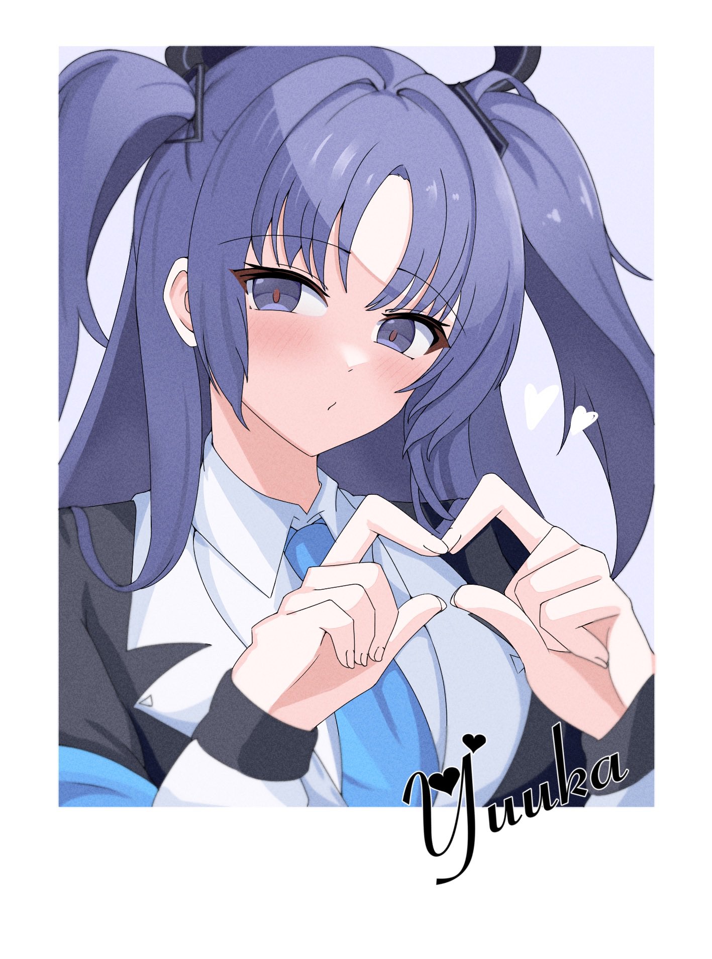 1girl blazer blue_archive blue_necktie character_name coat collared_shirt commentary english_commentary hair_ornament halo heart heart_hands highres jacket lengkuass long_hair long_sleeves looking_at_viewer necktie open_clothes open_coat parted_bangs parted_lips purple_eyes purple_hair school_uniform shirt sidelocks simple_background solo triangle_hair_ornament two-tone_background two_side_up white_coat white_shirt yuuka_(blue_archive)
