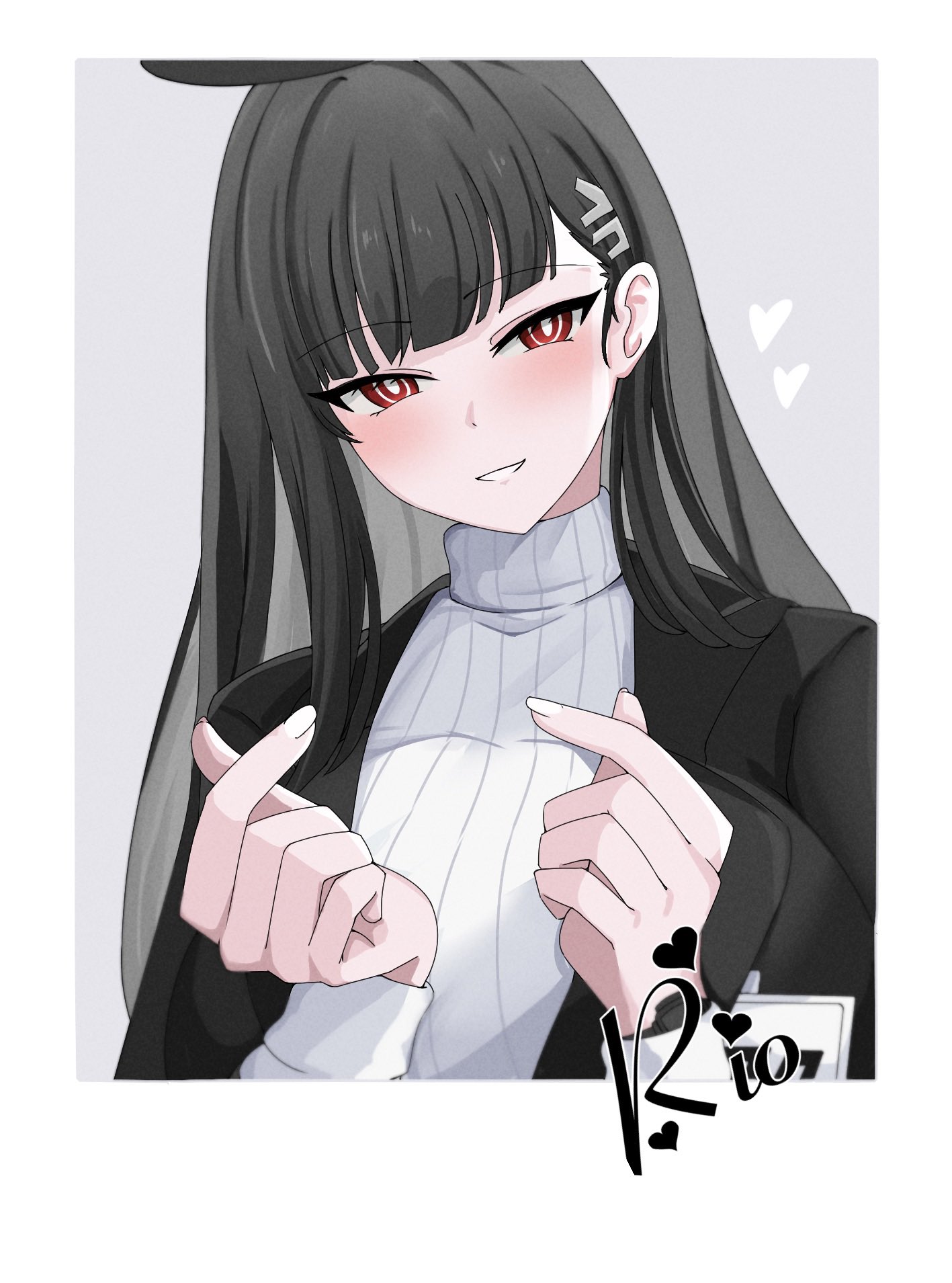 1girl :d black_hair blazer blue_archive blunt_bangs character_name commentary english_commentary hair_ornament hairclip halo highres jacket lengkuass long_sleeves looking_at_viewer open_mouth parted_lips portrait red_eyes rio_(blue_archive) short_hair sidelocks simple_background smile solo sweater turtleneck turtleneck_sweater two-tone_background