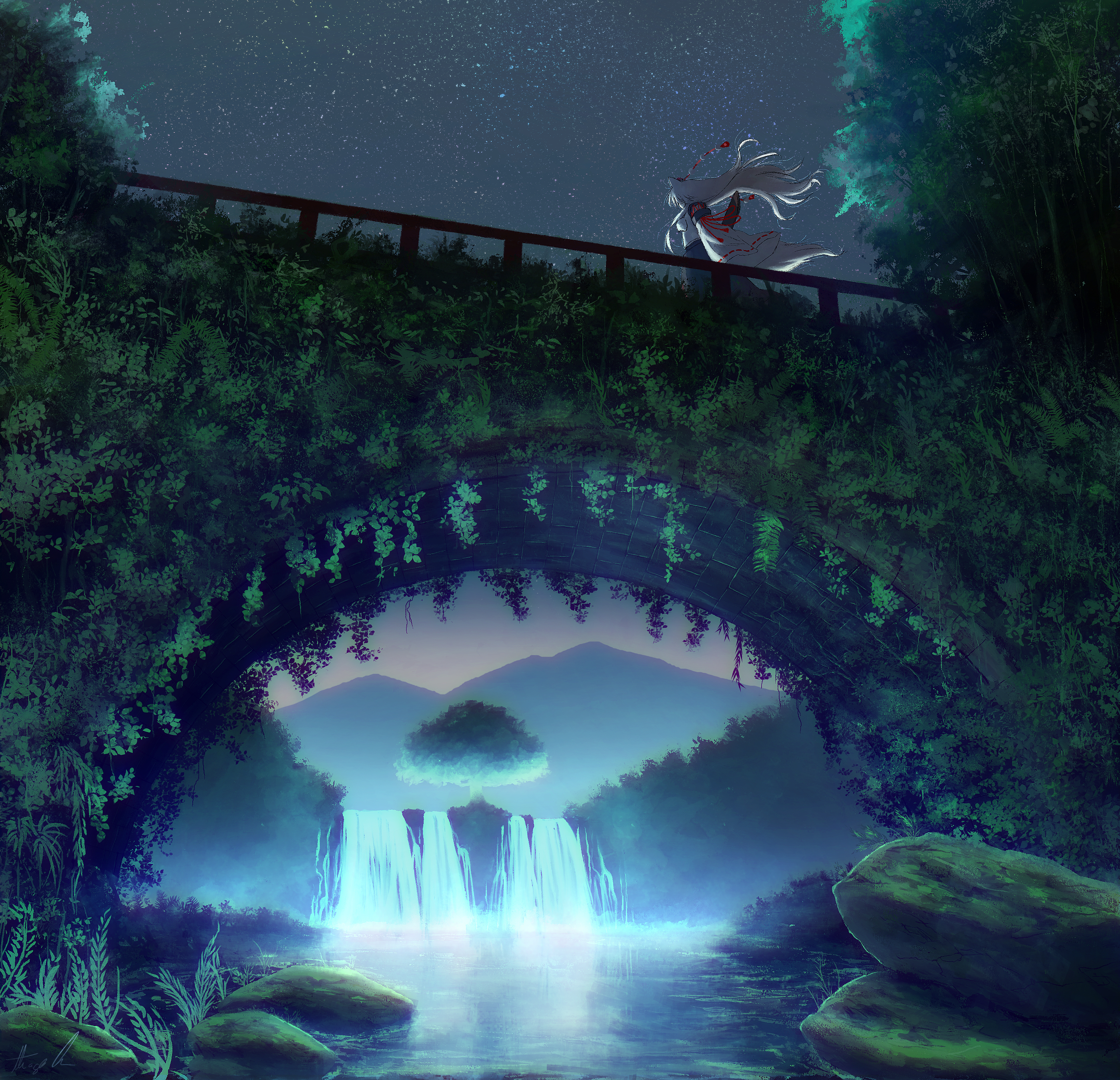 1girl absurdres alternate_hair_length alternate_hairstyle animal_ears arch_bridge arms_at_sides bridge floating hat highres inubashiri_momiji long_hair long_sleeves mountain mountainous_horizon nature oubachiago overgrown pom_pom_(clothes) procreate_(medium) river scabbard scenery sheath shirt skirt sky sleeves_past_wrists solo standing star_(sky) starry_sky tail touhou tree twilight very_long_hair water waterfall white_hair wide_sleeves wind wolf_ears wolf_girl wolf_tail