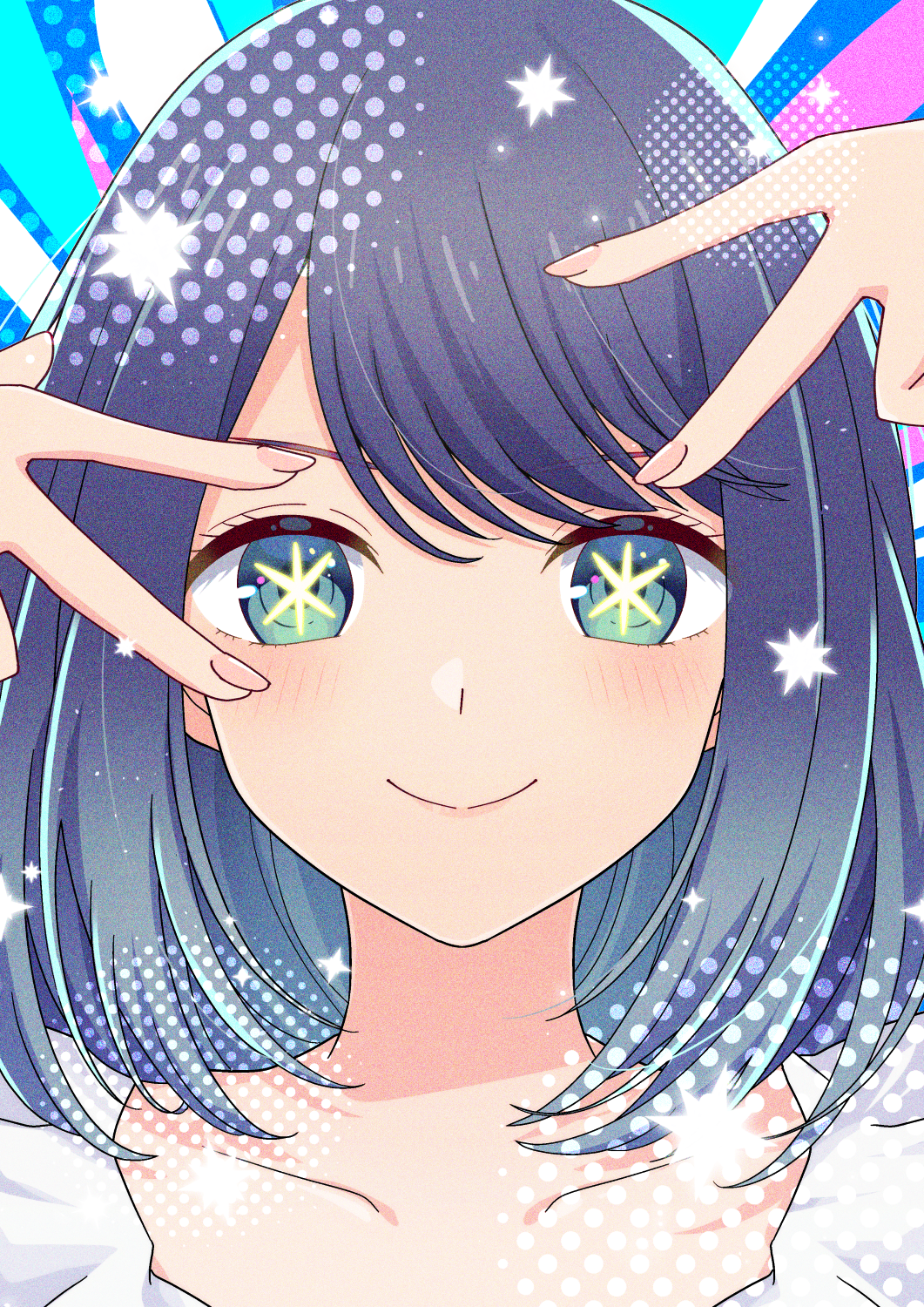 1girl blue_hair closed_mouth collarbone dress gradient_hair green_eyes highres hoshino_ai's_pose kurokawa_akane looking_at_viewer medium_hair multicolored_hair oshi_no_ko portrait smile solo sparkle star_(symbol) star_in_eye straight-on symbol_in_eye torinokawori v v_over_eye white_dress