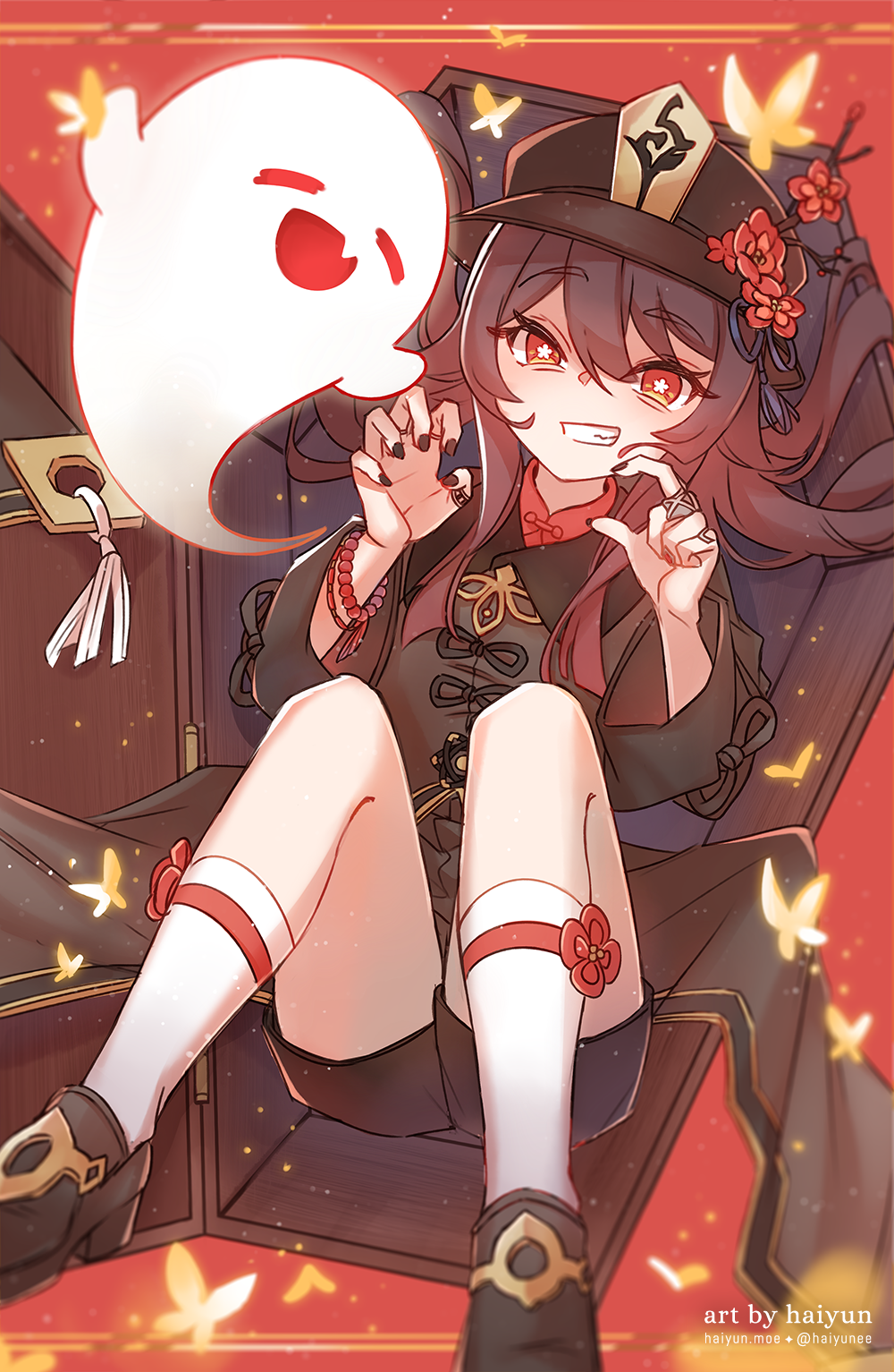 1girl artist_name bead_bracelet beads black_coat black_footwear black_hat black_nails black_shorts boo_tao_(genshin_impact) bracelet bright_pupils brown_hair coat coattails coffin commentary_request flower flower-shaped_pupils genshin_impact ghost haiyun hat hat_flower hat_tassel highres hu_tao_(genshin_impact) jewelry long_hair long_sleeves looking_at_viewer lying on_back orange_eyes red_background shorts socks solo symbol-shaped_pupils tailcoat twintails twitter_username white_pupils white_socks