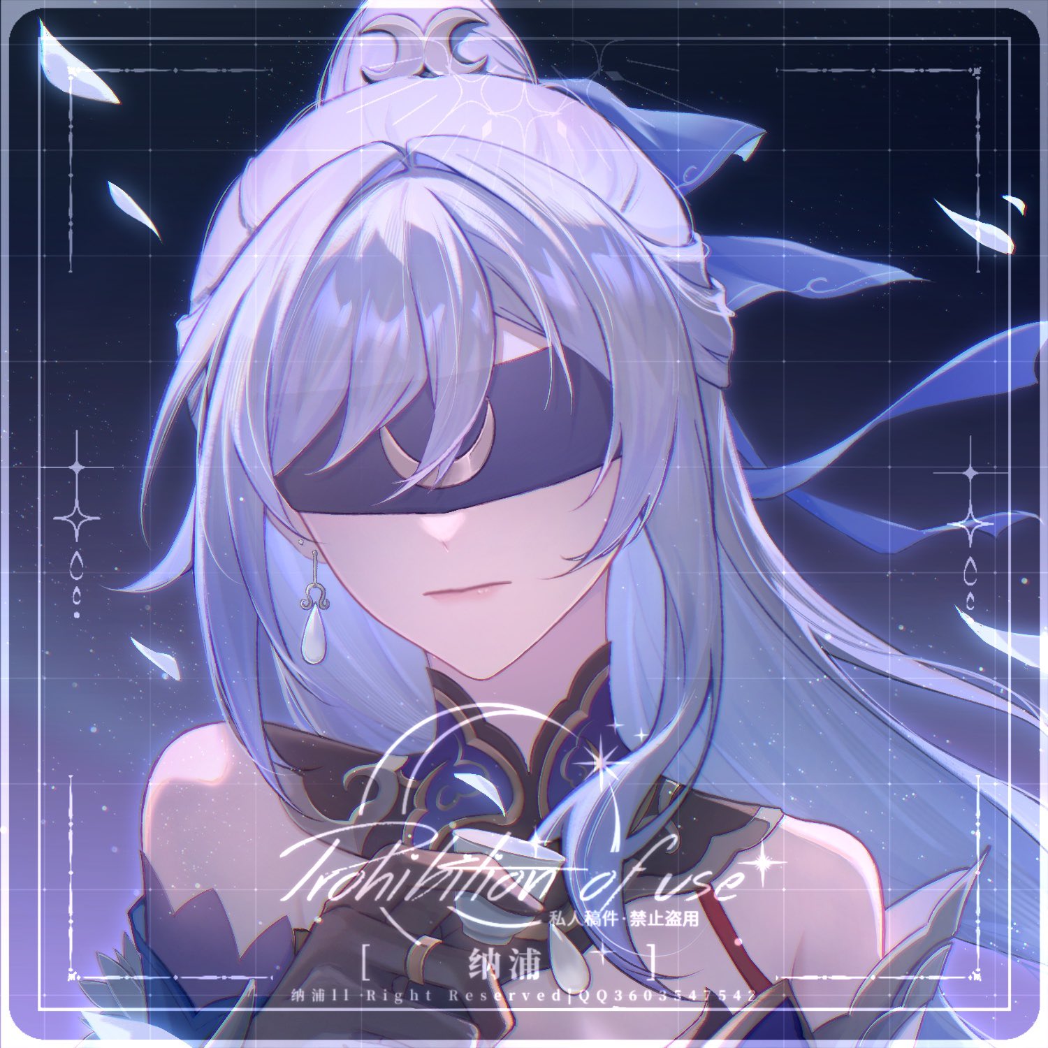 1girl bare_shoulders black_gloves blindfold commission crescent_print cup earrings english_text framed gloves half_updo highres holding holding_cup honkai:_star_rail honkai_(series) jewelry jingliu_(honkai:_star_rail) long_hair napppptt ponytail portrait ring sidelocks solo upper_body white_hair
