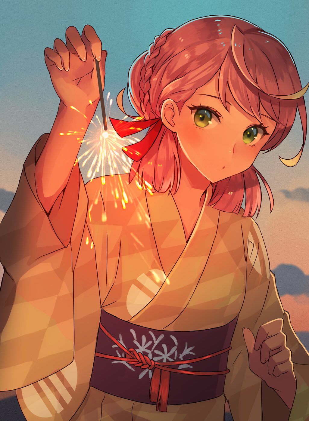 1girl akashi_(kancolle) akashi_(new_year)_(kancolle) akashi_(yukata)_(kancolle) blunt_tresses braid checkered_clothes checkered_kimono cloud day fireworks gradient_sky green_eyes green_kimono hair_ribbon highres japanese_clothes kantai_collection kashi_(yukata)_(kancolle) kasumi_(skchkko) kimono leaning_forward long_hair looking_at_viewer official_alternate_costume outdoors pink_hair ribbon sky solo sparkler sunset tress_ribbon upper_body yukata