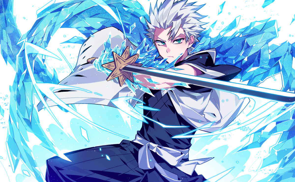 1boy black_hakama black_kimono bleach closed_mouth cowboy_shot cryokinesis dorae_(wlddj715) fighting_stance floating_clothes furrowed_brow green_eyes hair_slicked_back hakama hakama_pants haori hitsugaya_toushirou holding holding_sword holding_weapon hyourinmaru ice jacket japanese_clothes katana kimono looking_at_viewer male_focus pants sash serious shards short_hair solo spiked_hair standing sword taichou_haori weapon white_background white_hair white_jacket white_sash