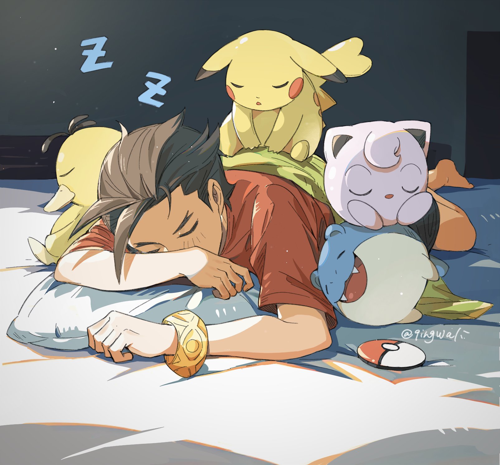 1boy ace_attorney antenna_hair apollo_justice bed blush bracelet brown_hair closed_eyes covered_mouth crossover gen_1_pokemon gen_3_pokemon highres jewelry jigglypuff kaeru_(qingwali) lying nintendo on_stomach pikachu pillow poke_ball pokemon pokemon_(creature) pokemon_sleep psyduck red_shirt shirt short_hair short_sleeves sleeping solo spheal t-shirt twitter_username z-ring zzz