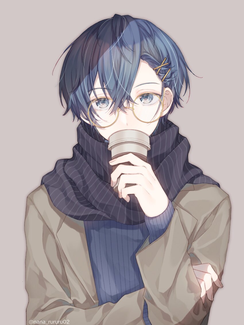 1boy alternate_hair_color bangs_pinned_back bespectacled black_scarf blue_eyes blue_hair blue_sweater brown_jacket colon_(stpri) commentary covered_mouth cup disposable_cup double-parted_bangs drink glasses grey_hair hair_behind_ear hair_between_eyes hair_ornament hairclip hand_on_own_arm holding holding_cup holding_drink jacket lapels layered_sleeves long_sleeves looking_at_viewer male_focus naruna_(star) open_clothes open_jacket pinstripe_scarf ribbed_sweater round_eyewear scarf short_hair simple_background solo strawberry_prince striped_clothes striped_scarf sweater upper_body vertical-striped_clothes vertical-striped_scarf winter_clothes x_hair_ornament yellow-framed_eyewear