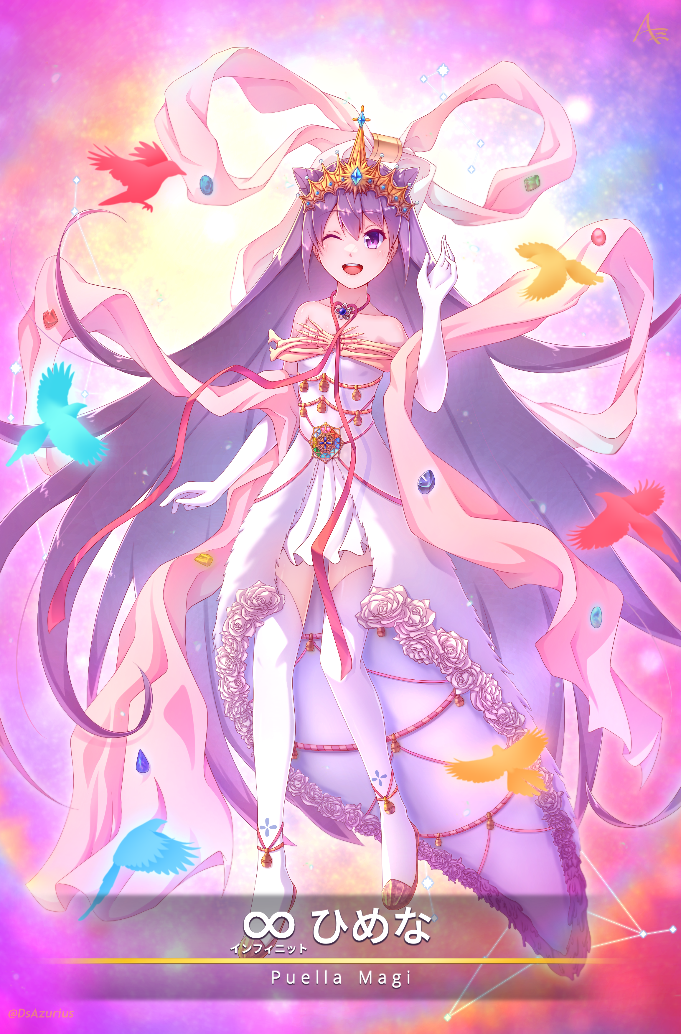 1girl :d absurdres aika_himena bird crown dress dsazurius flower-trimmed_dress hair_between_eyes highres long_hair magia_record:_mahou_shoujo_madoka_magica_gaiden mahou_shoujo_madoka_magica one_eye_closed open_mouth purple_eyes purple_hair smile solo thighhighs very_long_hair white_dress white_thighhighs