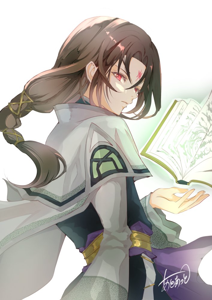 1boy artist_name atoatto black_hair book facial_mark fire_emblem fire_emblem:_radiant_dawn fire_emblem_heroes forehead_mark green_eyes green_hair holding holding_book long_hair looking_at_viewer low_ponytail nintendo official_alternate_costume ponytail scowl solo soren_(fire_emblem) soren_(radiant_confidant)_(fire_emblem) white_background
