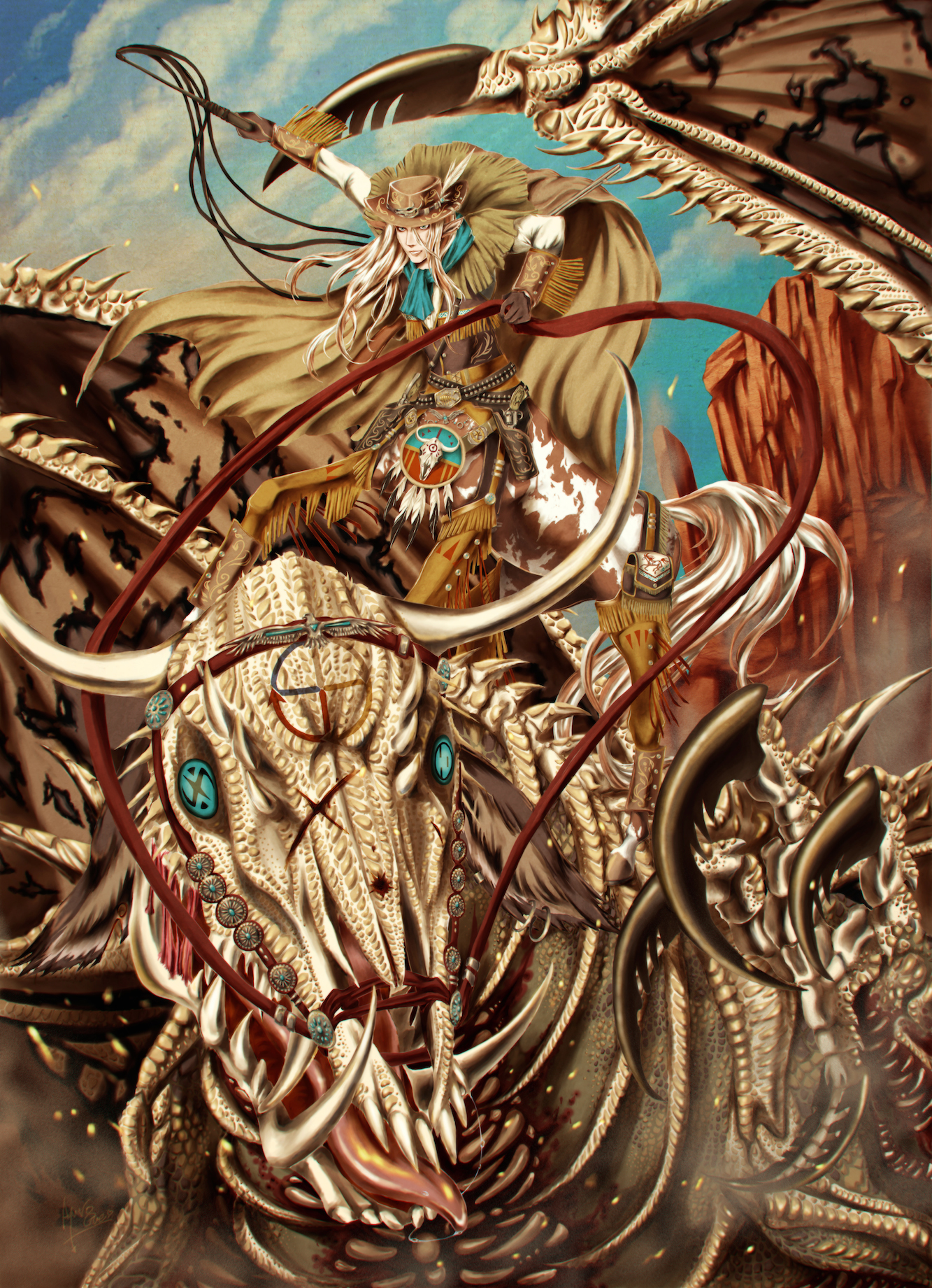 1boy aqua_scarf belt belt_pouch blonde_hair blue_eyes blue_sky bodice brown_belt brown_cape brown_headwear brown_thighhighs canyon cape centaur cloud commentary_request cowboy_hat creature day dragon riding_dragon full_body garter_straps gun hair_between_eyes hat highres holding holding_reins holding_riding_crop holster holstered horse_tail long_hair long_sleeves male_focus monster_boy multiple_legs nakai_keira original outdoors parted_lips pointy_ears pouch reins riding_crop scarf shirt sky standing tail taur thighhighs weapon white_shirt zombie_dragon
