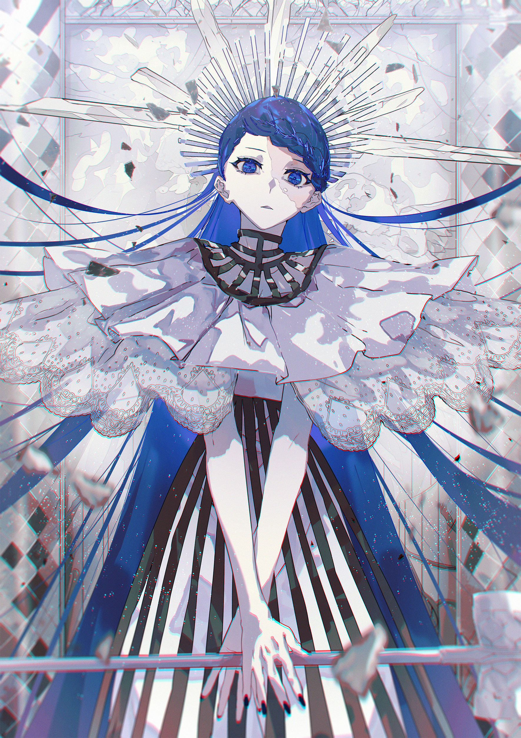 1girl absurdres ado_(utaite) black_nails blue_eyes blue_hair braid chromatic_aberration clothing_request cowboy_shot crossed_wrists debris dress expressionless fingernails french_braid gira_gira hammer head_tilt headpiece highres holding holding_hammer light_particles limited_palette long_hair looking_at_viewer parted_lips scar scar_on_face sledgehammer solo standing striped_clothes striped_dress to/garashi two-tone_dress vertical-striped_clothes vertical-striped_dress very_long_hair