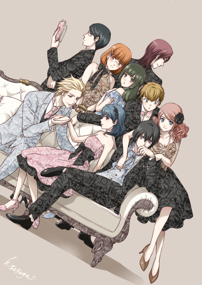4girls 5boys artist_name ashihara_miu bare_shoulders black_dress black_suit blonde_hair blue_eyes blue_hair blue_suit book brown_dress character_request couch domestic_na_kanojo dress formal_clothes fujii_natsuo glasses green_eyes green_hair grey_background hand_to_own_mouth holding holding_book holding_hands hug hug_from_behind kabasawa_fumino kashiwabara_momo kiriya_reiji looking_at_another looking_at_viewer matsukawa_j_alex medium_hair multicolored_dress multiple_boys multiple_girls on_couch pink_dress pink_hair print_dress print_suit profile red_eyes red_hair sasuga_kei shibasaki_subaru short_hair simple_background sitting standing strapless strapless_dress suit tachibana_rui yellow_eyes