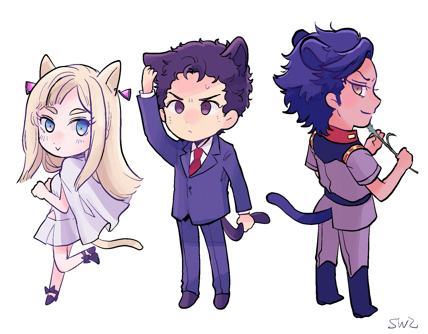 1girl 2boys :> animal_ears artist_name belt black_belt black_boots black_eyes black_hair black_shoes blonde_hair blue_eyes blue_jacket blue_pants blue_suit boots brown_eyes cat_boy cat_ears cat_girl cat_tail chibi closed_mouth collared_shirt dark-skinned_male dark_skin earrings earth_federation film_grain formal_clothes full_body gigi_andalusia grey_jacket grey_pants gundam gundam:_hathaway's_flash hathaway_noa highres holding holding_own_tail holding_plant jacket jewelry kemonomimi_mode kenneth_sleg long_hair long_sleeves looking_at_viewer looking_back messy_hair military_uniform multiple_boys necktie pants plant purple_hair red_necktie shirt shiwaza_(qiduizi) shoes short_hair short_sleeves sideburns signature simple_background smirk standing suit sweat tail white_background white_shirt wing_collar