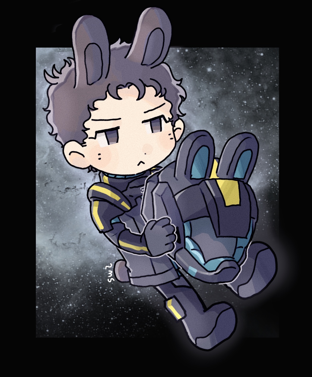 1boy :< animal_ear_headwear animal_ears artist_name black_border border brown_eyes brown_hair chibi closed_mouth expressionless fake_animal_ears film_grain full_body gundam gundam:_hathaway's_flash hathaway_noa helmet highres holding holding_unworn_helmet jitome male_focus mecha_pilot_suit messy_hair normal_suit_(gundam) outside_border rabbit_ears rabbit_tail shiwaza_(qiduizi) short_hair signature solo space spacesuit tail unworn_helmet