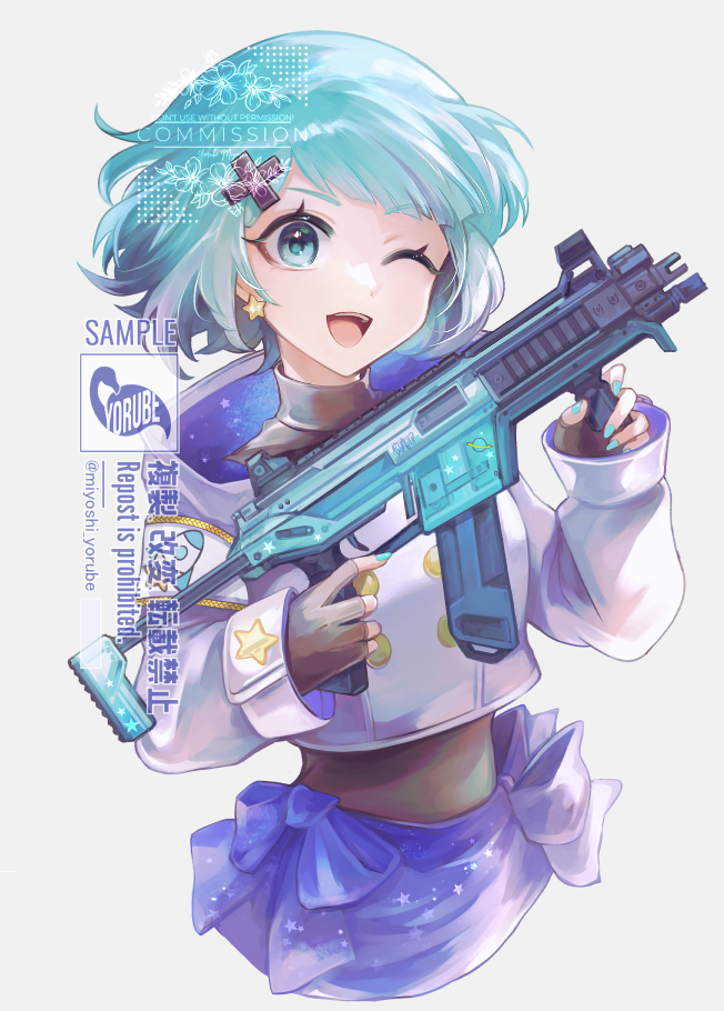 1girl :d apex_legends armband artist_name black_shirt blue_eyes blue_nails bow breasts commission d-pad d-pad_hair_ornament earrings artistic_error fingerless_gloves foregrip gloves grey_background gun hair_ornament holding holding_gun holding_weapon hood hood_down hoodie indie_virtual_youtuber jewelry medium_breasts misumi_sumomo miyoshi_yorube one_eye_closed open_mouth purple_bow purple_hoodie purple_skirt r-99_smg sample_watermark shirt skirt smile solo star_(symbol) star_earrings submachine_gun trigger_discipline virtual_youtuber watermark weapon