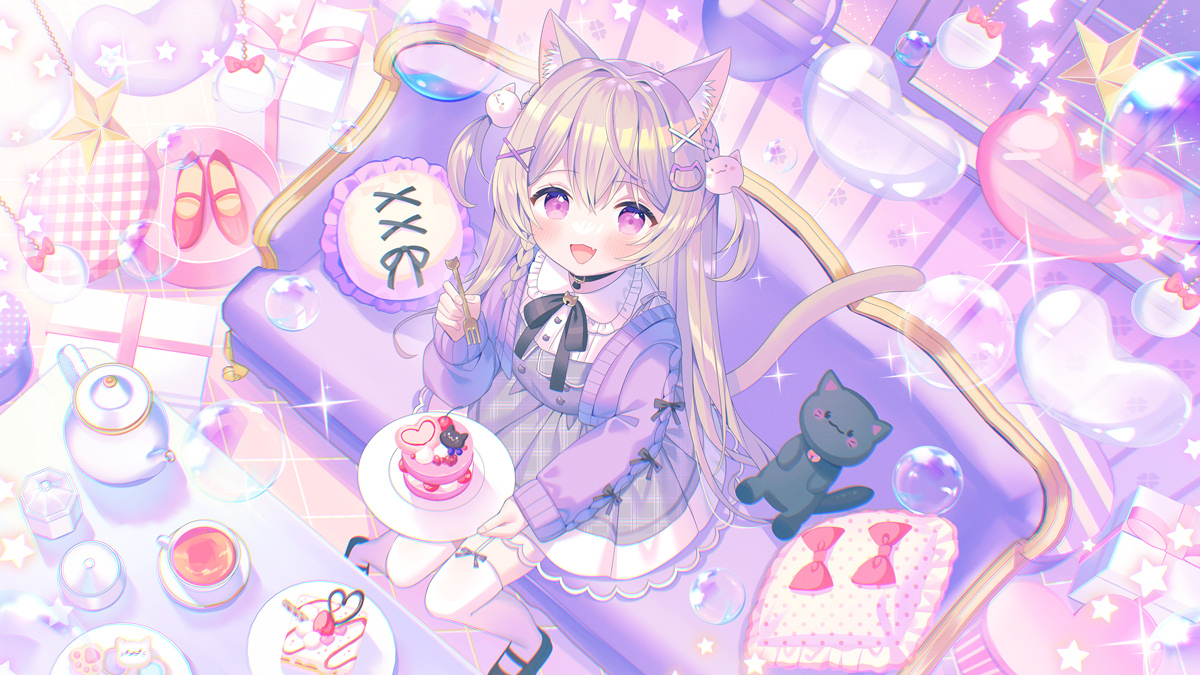 1girl :d animal_ears black_bow black_footwear black_ribbon blush bow braid cat_ears cat_girl cat_tail cup fang food fork grey_skirt hair_ornament holding holding_fork holding_plate ikari_(aor3507) indie_virtual_youtuber light_brown_hair long_hair long_sleeves looking_at_viewer minaneko_mai neck_ribbon open_mouth pill plate pleated_skirt purple_eyes red_bow ribbon sitting skin_fang skirt smile socks solo tail teacup teapot thighhighs virtual_youtuber white_socks yume_kawaii