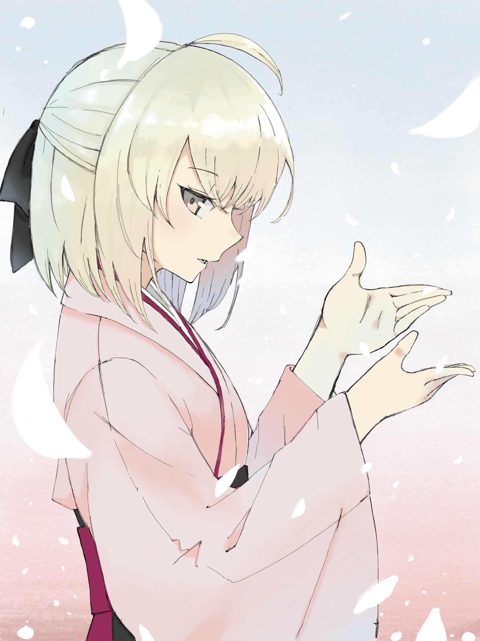 1girl ahoge black_ribbon fate_(series) from_side hair_ribbon half_updo hands_up highres japanese_clothes kimono koha-ace light_smile looking_at_viewer okita_souji_(fate) okita_souji_(first_ascension)_(fate) okita_souji_(koha-ace) parted_lips petals pink_eyes pink_kimono profile ribbon short_hair sideways_glance solo tenohira_(tenoo) upper_body white_hair