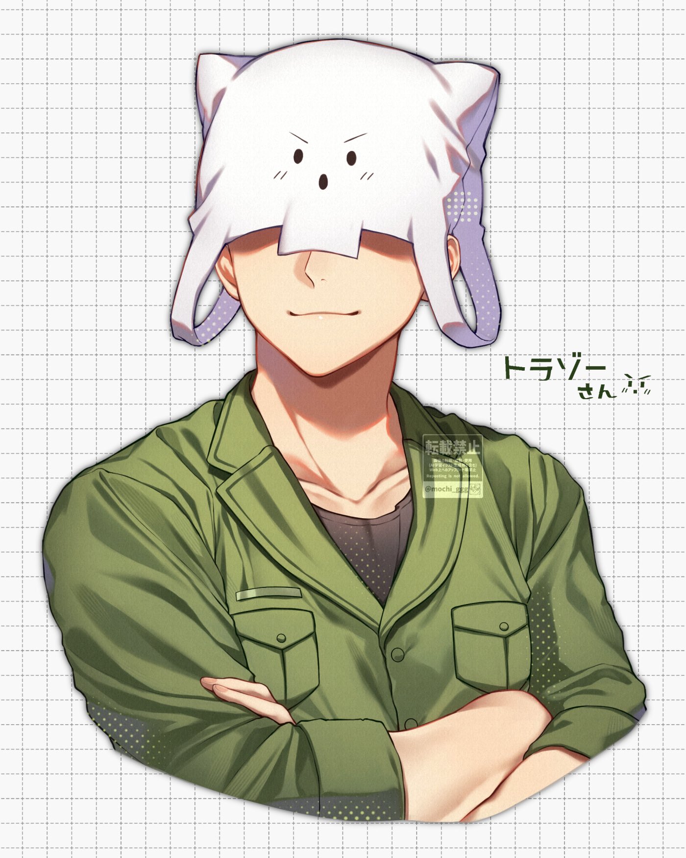 1boy animal_hat character_request closed_mouth crossed_arms green_shirt hat highres male_focus mochi_ggg nichijo_gumi shirt smile solo white_hat